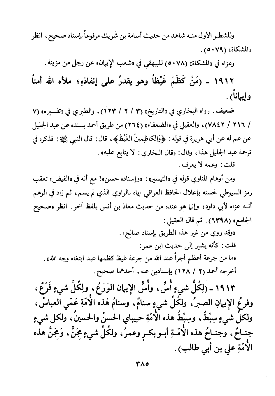 1913 - " لكل شيء أس، وأس الإيمان الورع، ولكل شيء فرع، وفرع الإيمان الصبر، ولكل شيء سنام، وسنام هذه الأمة عمي العباس، ولكل شيء سبط، وسبط هذه الأمة حبيباي الحسن والحسين، ولكل شيء جناح، وجناح هذه الأمة أبو بكر وعمر، ولكل شيء مجن، ومجن هذه الأمة علي بن أبي طالب ".