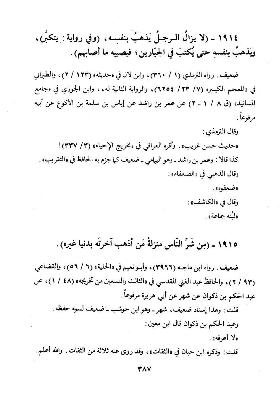 1914 - " لا يزال الرجل يذهب بنفسه، (وفي رواية: يتكبر) ، ويذهب بنفسه حتى يكتب في الجبارين، فيصبه ما أصابهم ".