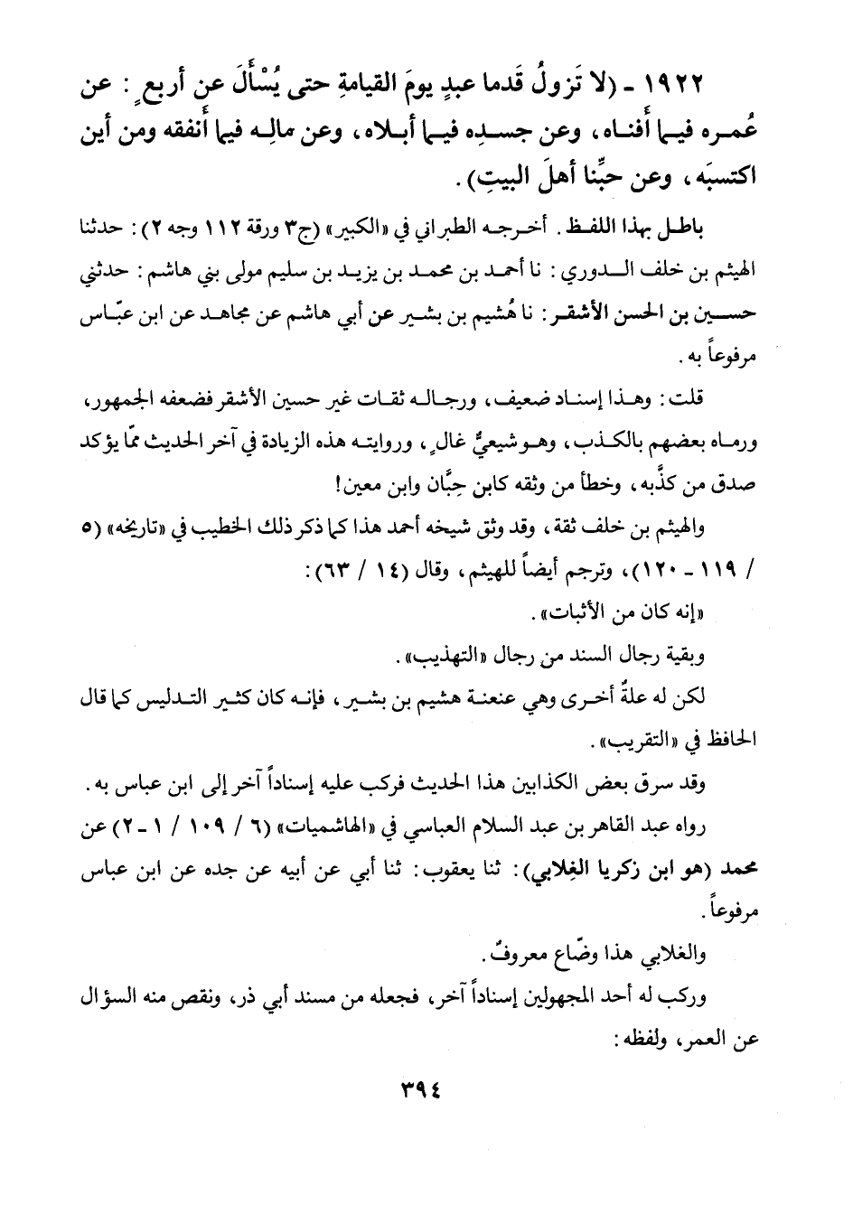 1922 - " لا تزول قدما عبد يوم القيامة حتى يسأل عن أربع: عن عمره فيما أفناه، وعن جسده فيما أبلاه، وعن ماله فيما أنفقه ومن أين اكتسبه، وعن حبنا أهل البيت ".