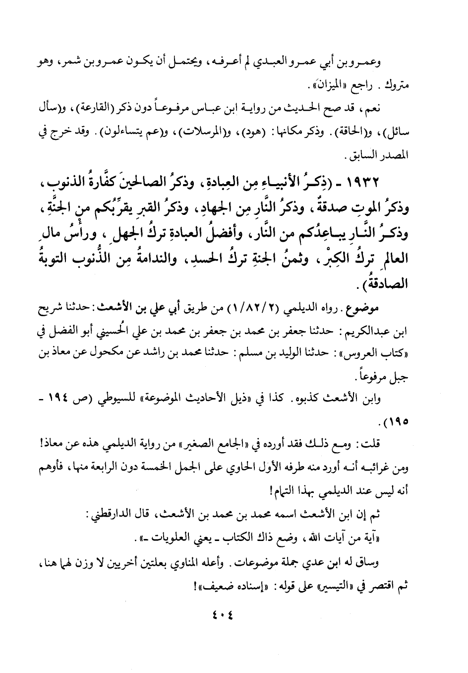 1932 - " ذكر الأنبياء من العبادة، وذكر الصالحين كفارة الذنوب، وذكر الموت صدقة، وذكر النار من الجهاد، وذكر القبر يقربكم من الجنة، وذكر النار يباعدكم من النار، وأفضل العبادة ترك الجهل، ورأس مال العالم ترك الكبر، وثمن الجنة
