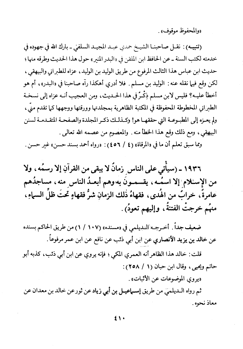 1936 - " سيأتي على الناس زمان لا يبقي من القرآن إلا رسمه، ولا من الإسلام إلا اسمه، يقسمون به وهم أبعد الناس منه، مساجدهم عامرة، خراب من الهدى، فقهاء ذلك الزمان شر فقهاء تحت ظل السماء، منهم خرجت الفتنة، وإليهم تعود ".