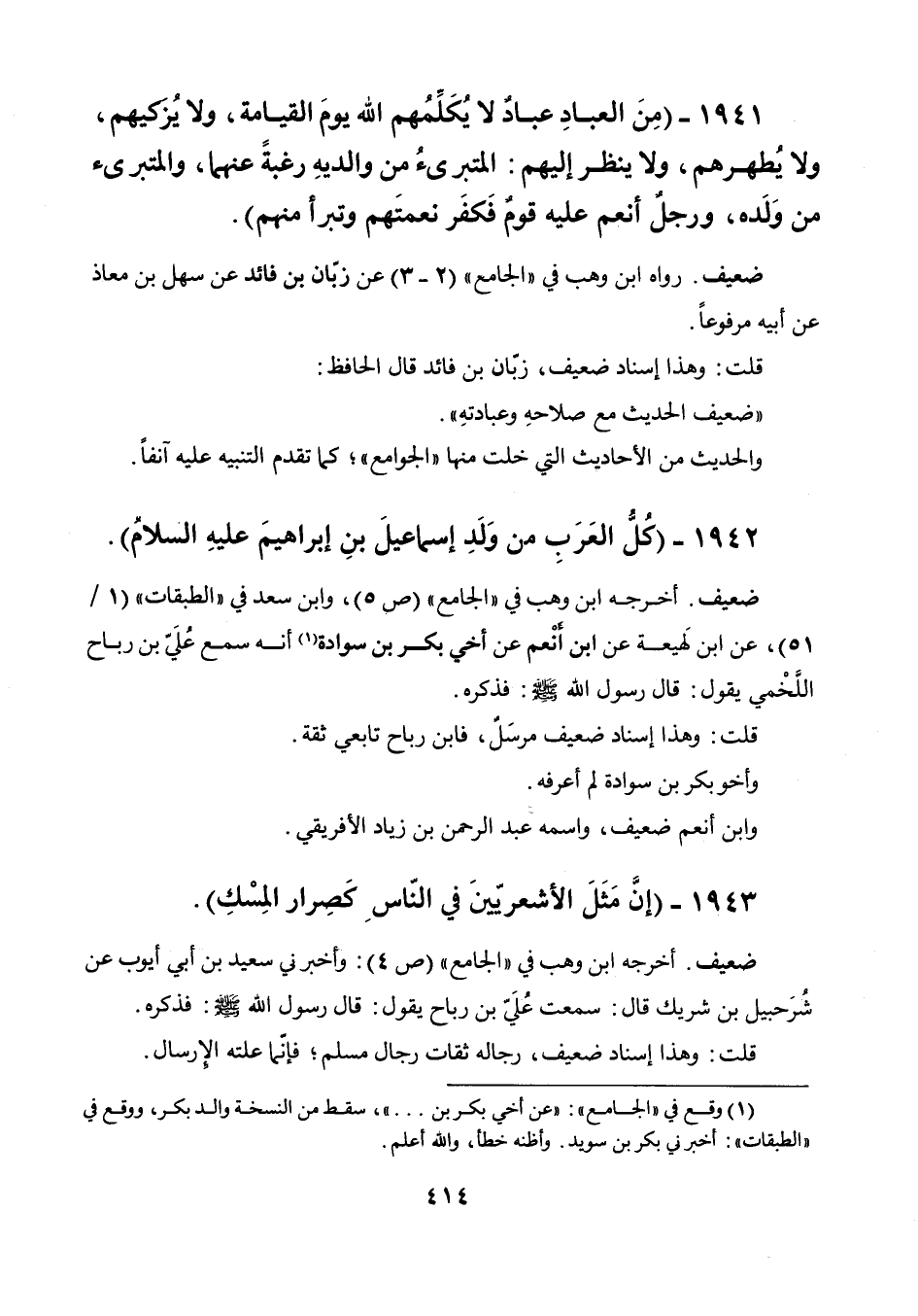 1941 - " من العباد عباد لا يكلمهم الله يوم القيامة ولا يزكيهم ولا يطهرهم ولا ينظر إليهم: المتبرىء من والديه رغبة عنهما، والمتبرىء من ولده، ورجل أنعم عليه قوم فكفر نعمتهم وتبرأ منهم ".