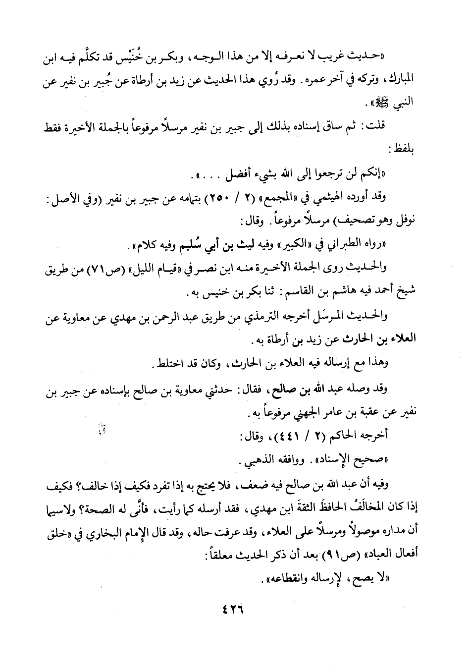 لن ترجعوا إلى الله بشيء أفضل ... ". وقد أورده الهيثمي في " المجمع " (2 / 250) بتمامه عن جبير بن نفير (وفي الأصل نوفل وهو تصحيف) مرسلا مرفوعا.