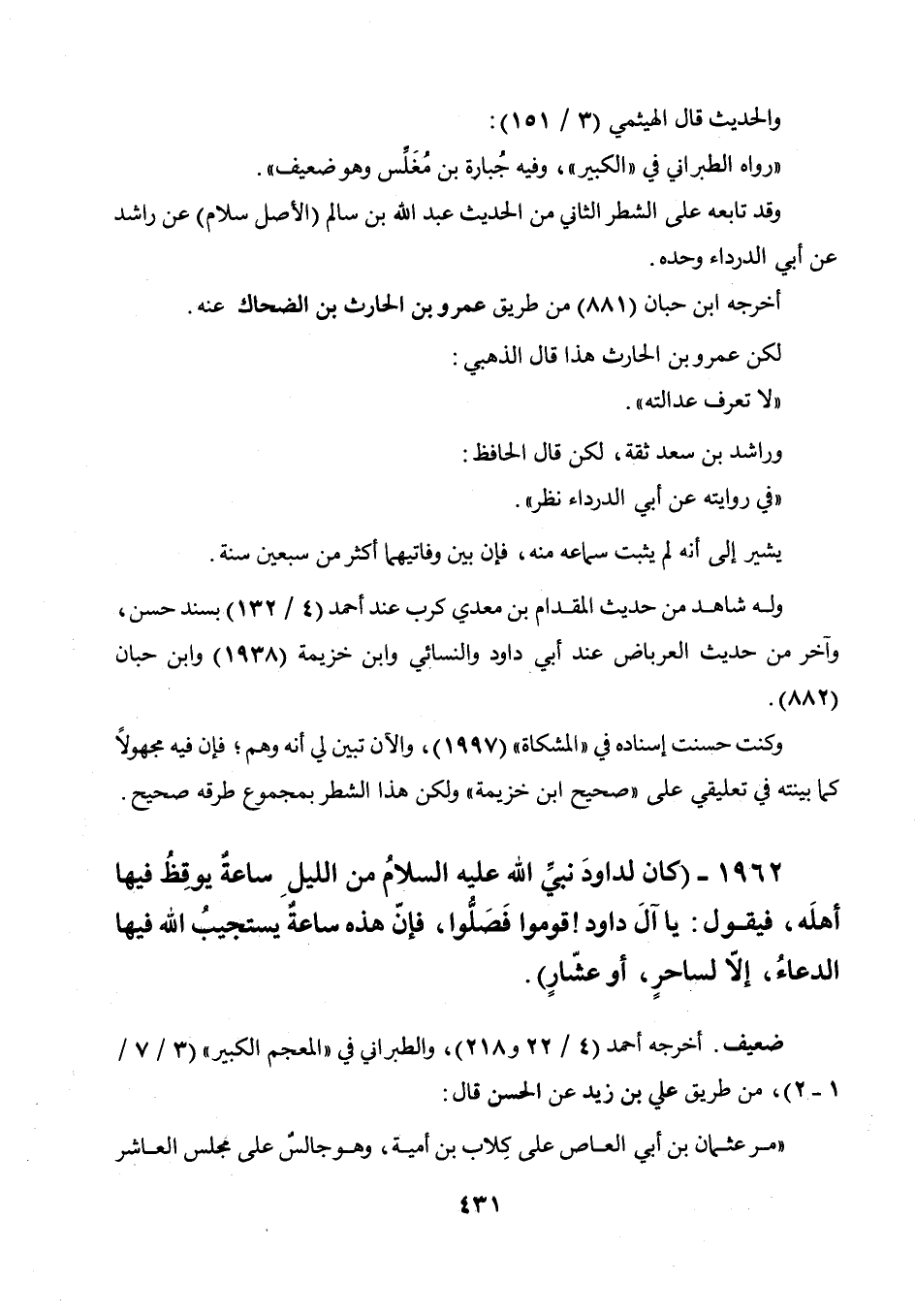 1962 - " كان لداود نبي الله عليه السلام من الليل ساعة يوقظ فيها أهله، فيقول: يا آل داود! قوموا فصلوا، فإن هذه ساعة يستجيب الله فيها الدعاء، إلا لساحر، أوعشار ".