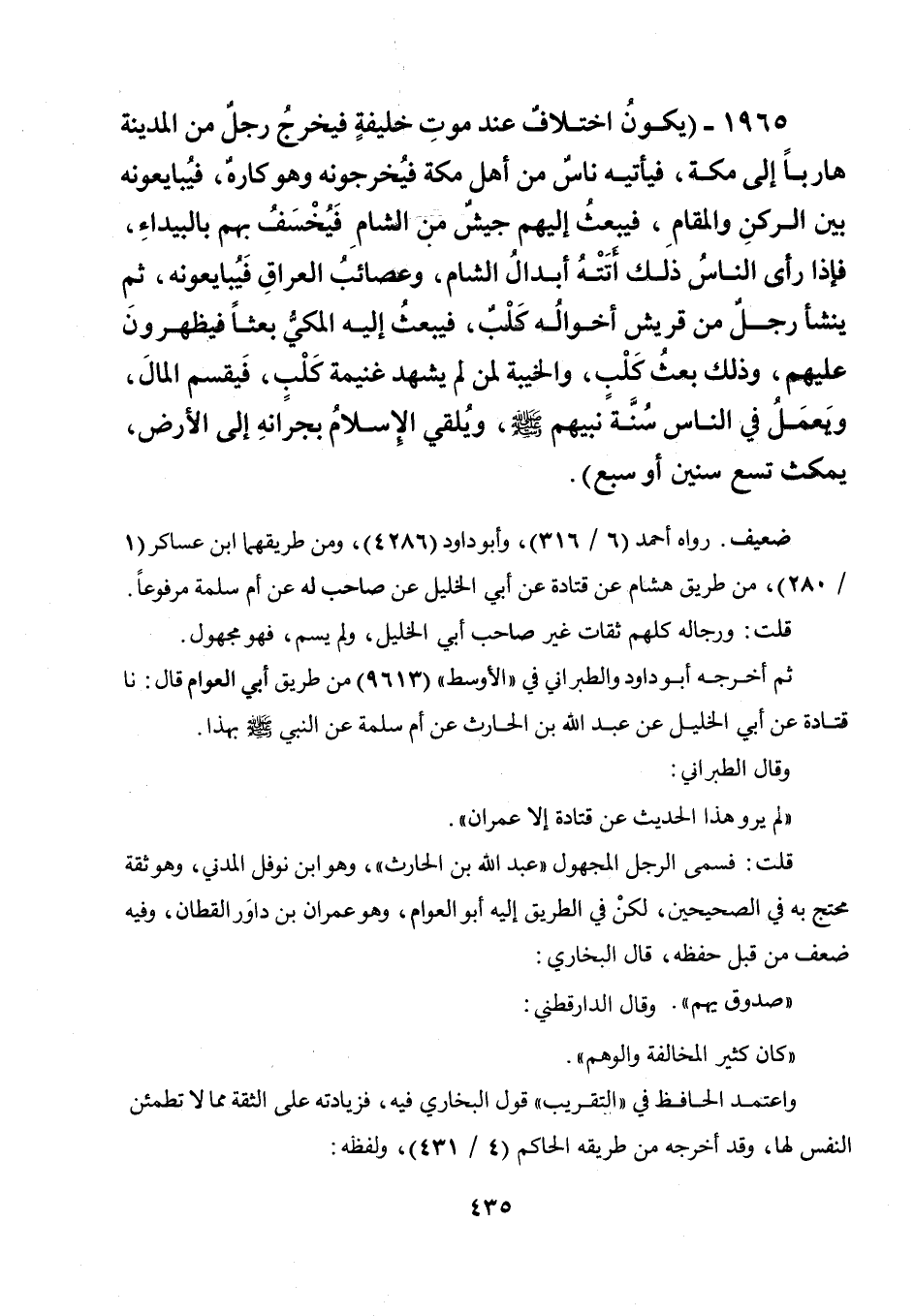 1965 - " يكون اختلاف عند موت خليفة فيخرج رجل من المدينة هاربا إلى مكة، فيأتيه ناس من أهل مكة فيخرجونه وهو كاره، فيبايعونه بين الركن والمقام، فيبعث إليهم جيش من الشام فيخسف بهم في البيداء، فإذا رأى الناس ذلك أتته أبدال الشام، وعصائب العراق فيبايعونه، ثم ينشأ رجل من قريش أخواله كلب، فيبعث إليه المكي بعثا فيظهرون عليهم، وذلك بعث كلب، والخيبة لمن لم يشهد غنيمة كلب، فيقسم المال، ويعمل في الناس سنة نبيهم صلى الله عليه وسلم، ويلقي الإسلام بجرانه إلى الأرض، يمكث تسع سنين أوسبع ".