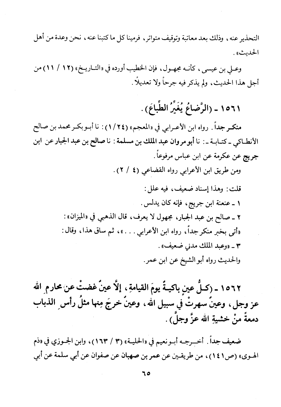 1562 - " كل عين باكية يوم القيامة، إلا عين غضت عن محارم الله عز وجل وعين سهرت في سبيل الله وعين خرج منها مثل رأس الذباب دمعة من خشية الله عز وجل ".