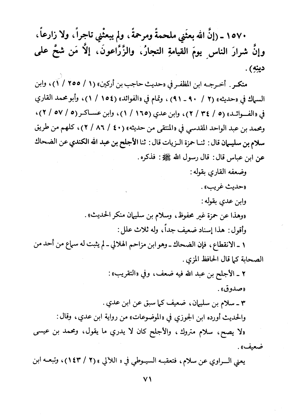 3 - سلام بن سليمان ضعيف كما سبق عن ابن عدي. والحديث أورده ابن الجوزي في " الموضوعات " من رواية ابن عدي، وقال: " لا يصح، سلام متروك، والأجلح كان لا يدري ما يقول، ومحمد بن عيسى ضعيف " يعني الراوي عن سلام، فتعقبه السيوطي في " اللآلي " (2 / 143) وتبعه ابن