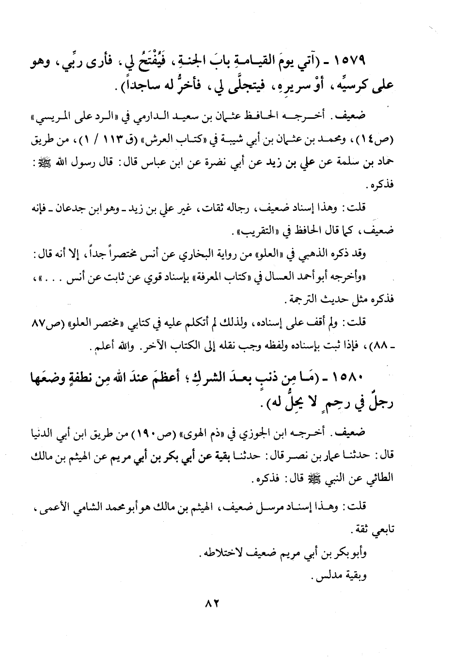 1579 - " آتي يوم القيامة باب الجنة، فيفتح لي، فأرى ربي وهو على كرسيه، أوسريره، فيتجلى لي، فأخر له ساجدا ".