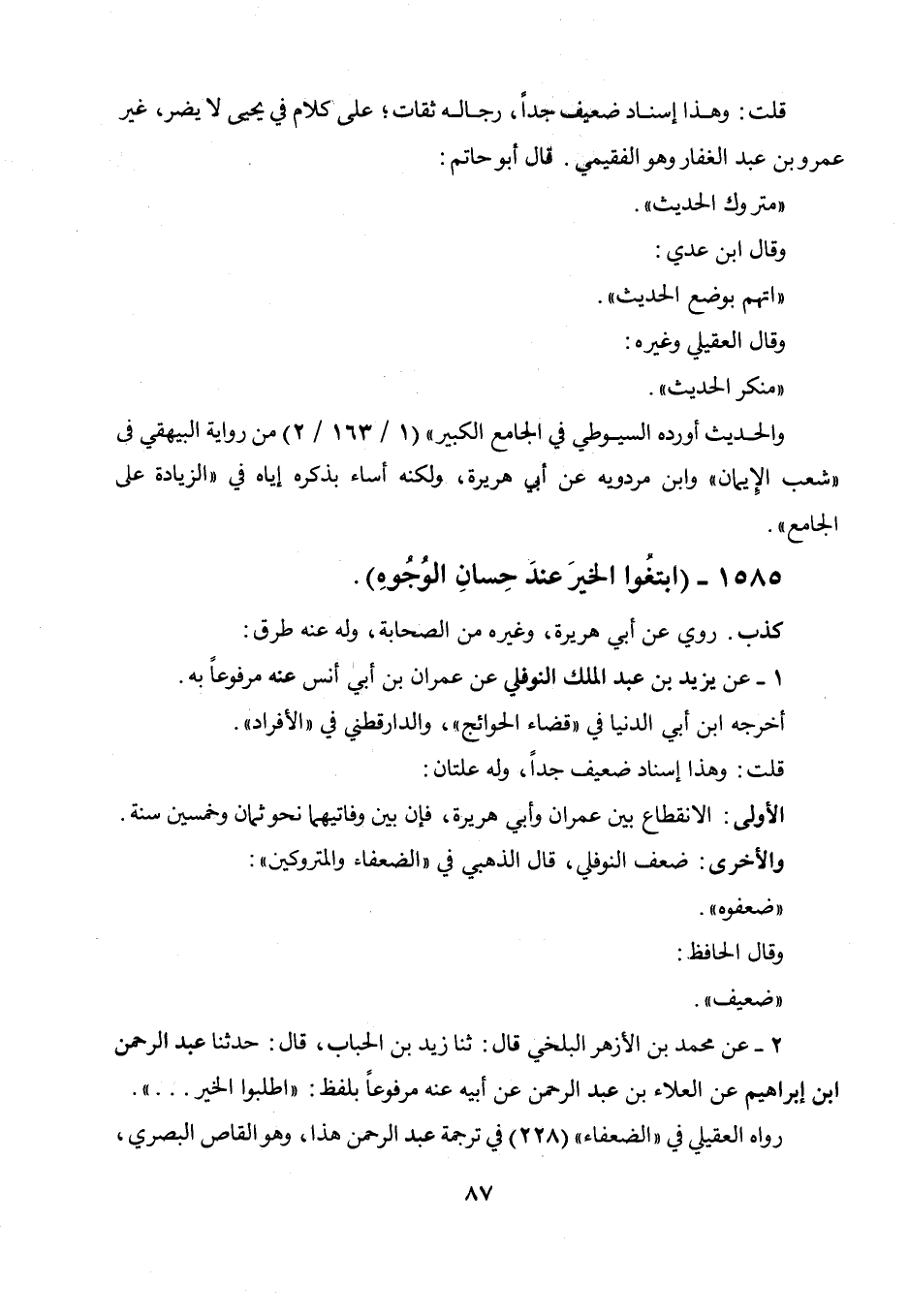 قلت: وهذا إسناد ضعيف جدا، وله علتان: الأولى: الانقطاع بين عمران وأبي هريرة، فإن بين وفاتيهما نحوثمان وخمسين سنة. والأخرى: ضعف النوفلي، قال الذهبي في " الضعفاء والمتروكين ": " ضعفوه ". وقال الحافظ: " ضعيف ".