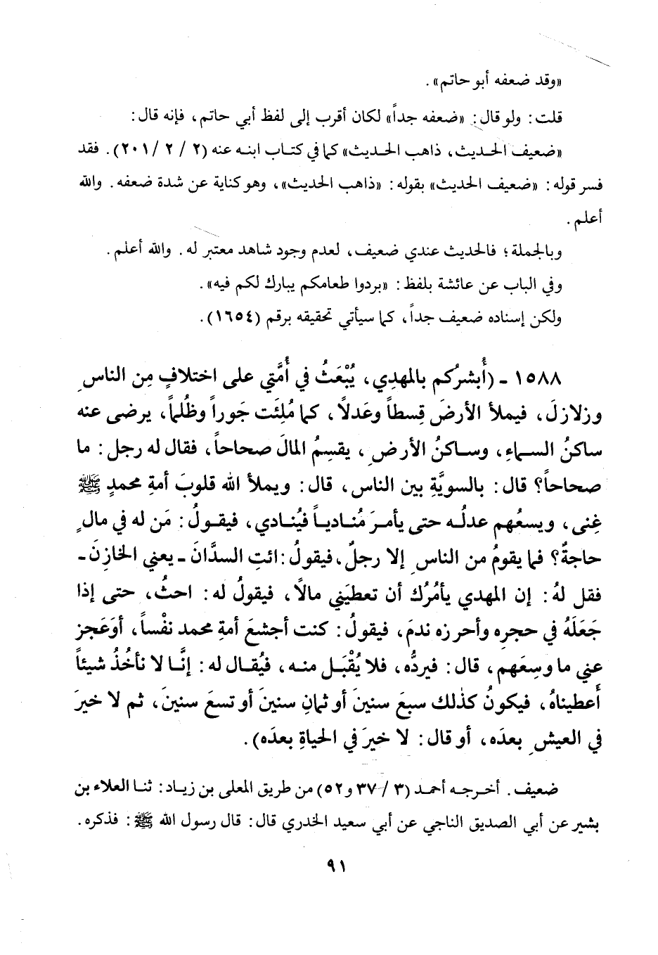1588 - " أبشركم بالمهدي، يبعث في أمتي على اختلاف من الناس وزلازل، فيملأ الأرض قسطا وعدلا، كما ملئت جورا وظلما، يرضى عنه ساكن السماء وساكن الأرض، يقسم المال صحاحا، فقال له رجل: ما صحاحا؟ قال: بالسوية بين الناس، قال: ويملأ الله قلوب أمة محمد صلى الله عليه وسلم غنى، ويسعهم عدله حتى يأمر