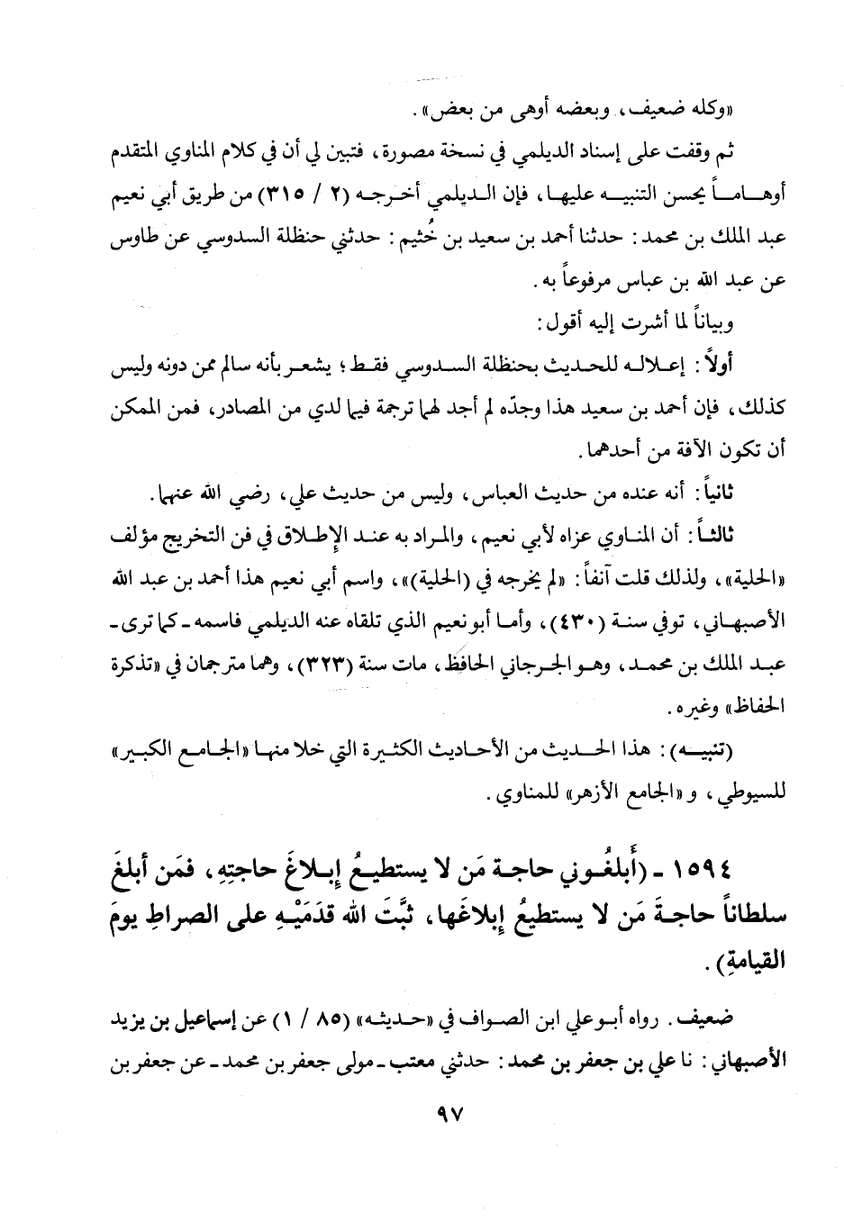 " وكله ضعيف، وبعضه أوهى من بعض ". ثم وقفت على إسناد الديلمي في نسخة مصورة، فتبين لي أن في كلام المناوي المتقدم أوهاما يحسن التنبيه عليها، فإن الديلمي أخرجه (2 / 315) من طريق أبي نعيم عبد الملك بن محمد: حدثنا أحمد بن سعيد بن خثيم حدثني حنظلة السدوسي عن طاووس عن عبد الله بن عباس مرفوعا به. وبيانا لما أشرت إليه أقول: أولا: إعلاله للحديث بحنظلة السدوسي فقط يشعر بأنه سالم ممن دونه وليس كذلك، فإن أحمد بن سعيد هذا وجده لم أجد لهما ترجمة فيما لدي من المصادر، فمن الممكن أن تكون الآفة من أحدهما. ثانيا: أنه عنده من حديث العباس، وليس من حديث علي، رضي الله عنهما. ثالثا: أن المناوي عزاه لأبي نعيم، والمراد به عند الإطلاق في فن التخريج مؤلف " الحلية "، ولذلك قلت آنفا: " لم يخرجه في (الحلية) "، واسم أبي نعيم هذا أحمد بن عبد الله الأصبهاني، توفي سنة (430) ، وأما أبو نعيم الذي تلقاه عنه الديلمي فاسمه - كما ترى - عبد الملك بن محمد، وهو الجرجاني الحافظ، مات سنة (323) ، وهما مترجمان في " تذكرة الحفاظ " وغيره.