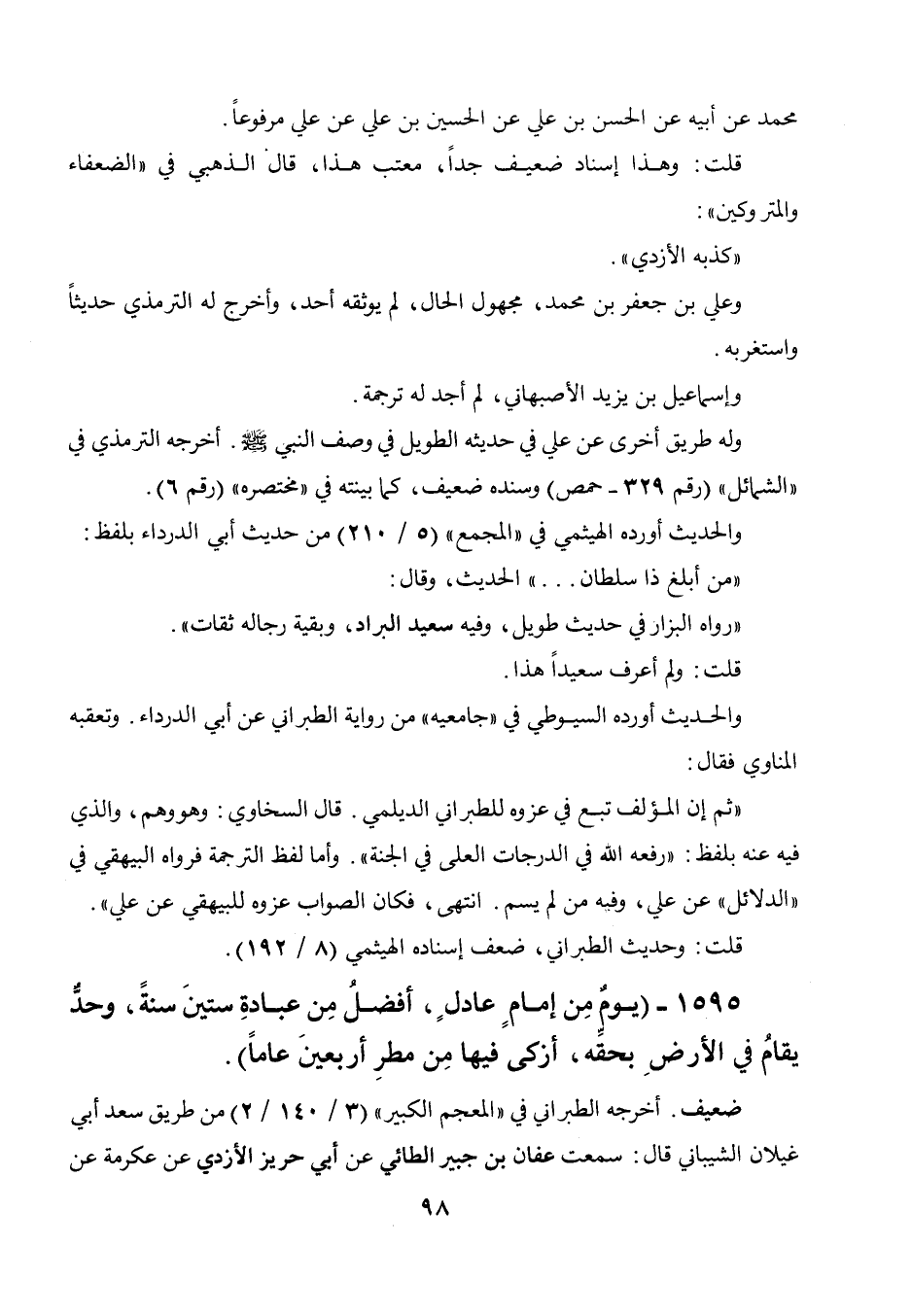 1595 - " يوم من إمام عادل أفضل من عبادة ستين سنة، وحد يقام في الأرض بحقه أزكى فيها من مطر أربعين عاما ".