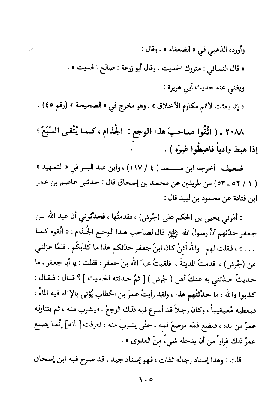 2088 - " اتقوا صاحب هذا الوجع: الجذام، كما يتقى السبع؛ إذا هبط واديا فاهبوا غيره ".