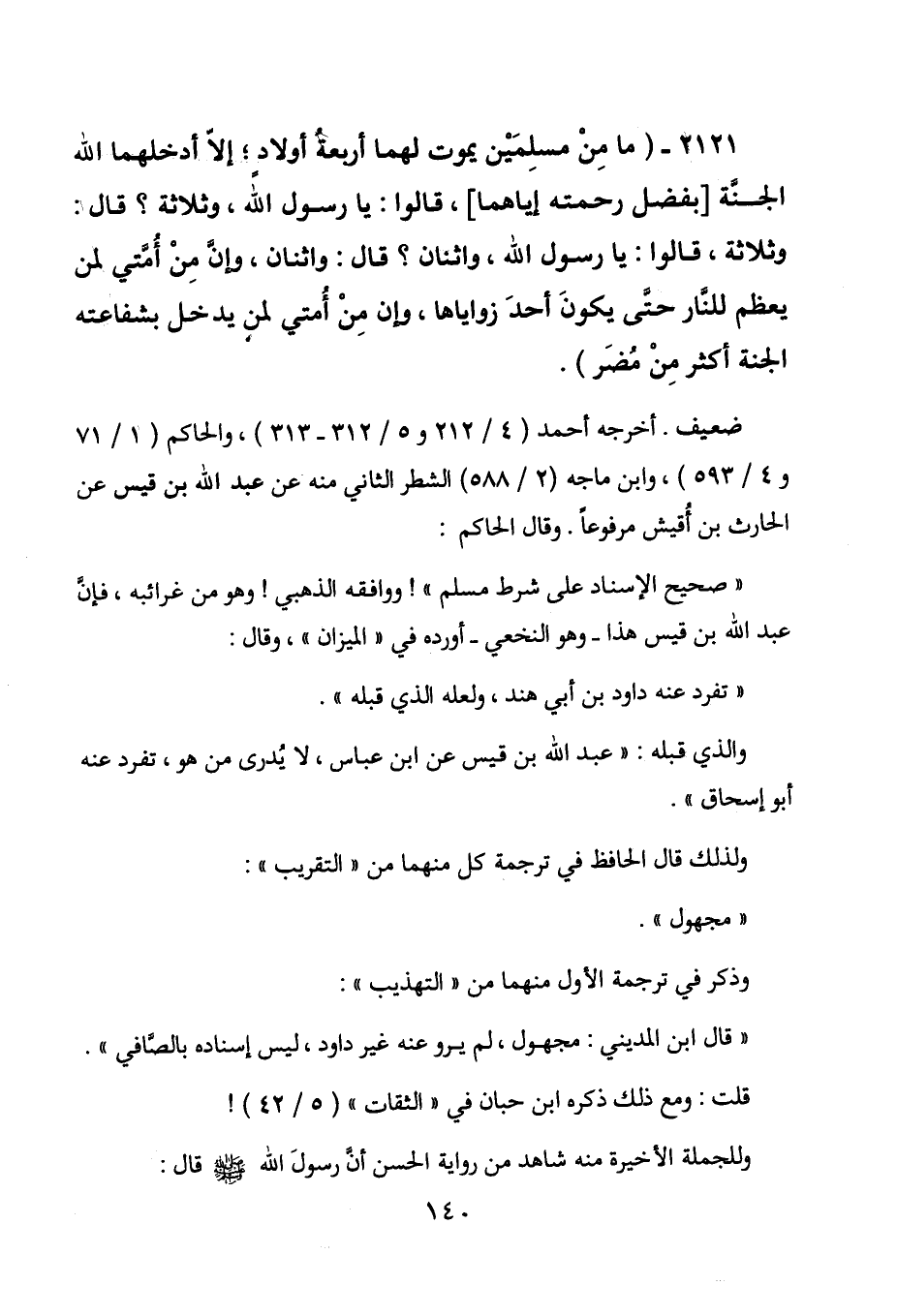 2121 - " ما من مسلمين يموت لهما أربعة أولاد؛ إلا أدخلهما الله الجنة [بفضل رحمته
