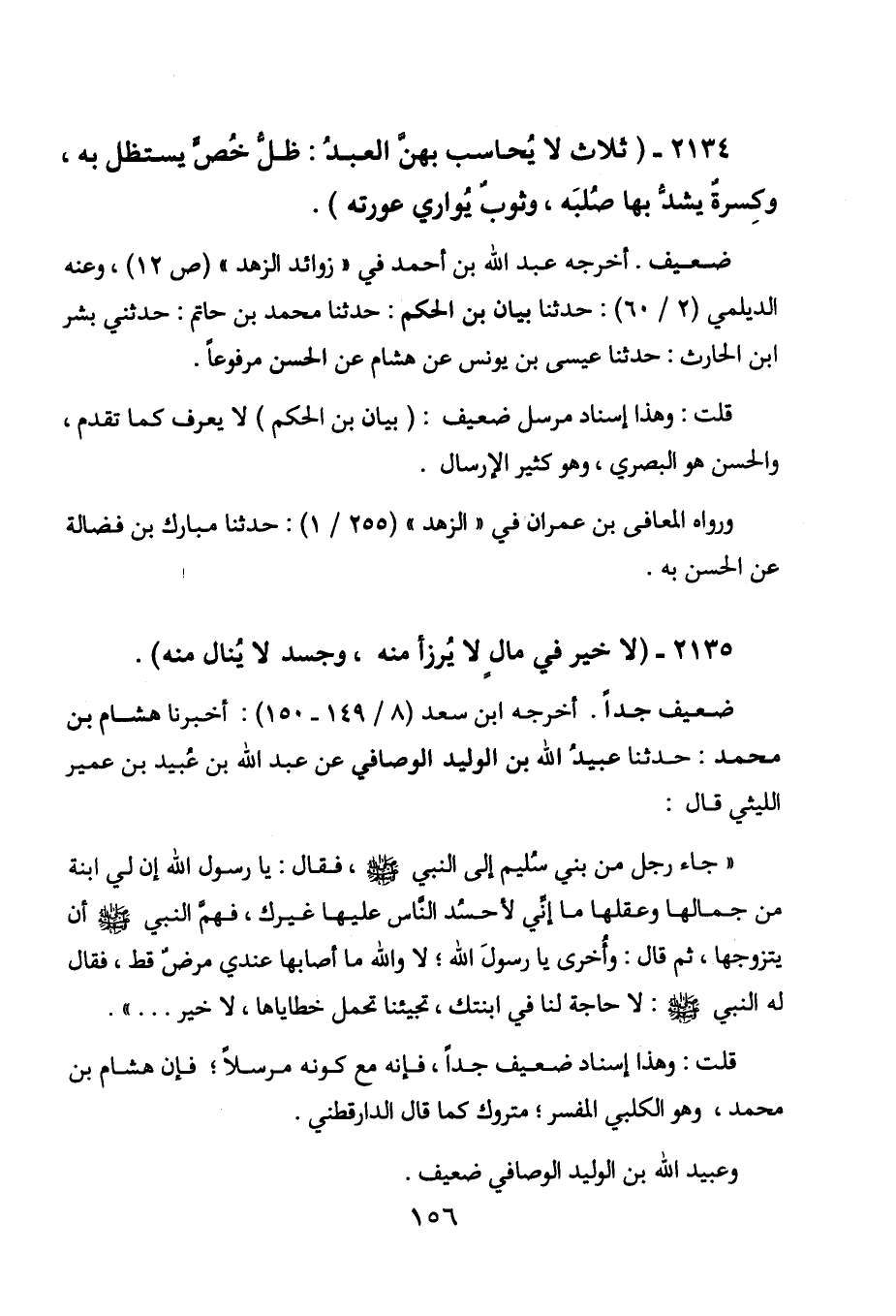 2134 - " ثلاث لا يحاسب بهن العبد: ظل خص يستظل به، وكسرة يشد بها صلبه، وثوب