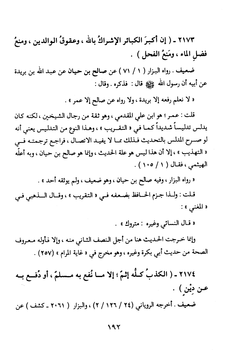 2173 - " إن أكبر الكبائر الإشراك بالله، وعقوق الوالدين، ومنع فضل الماء، ومنع