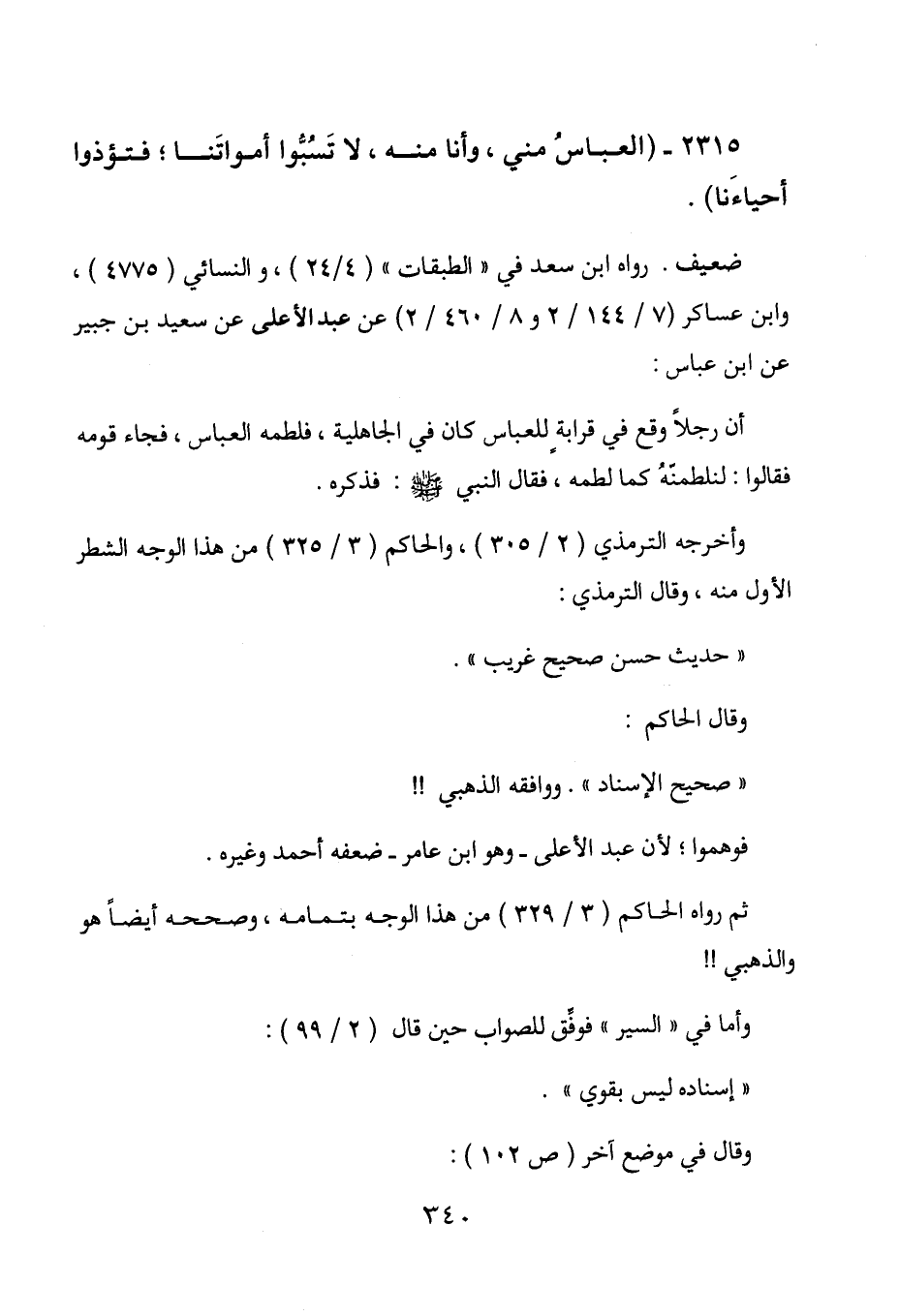 2315 - " العباس مني، وأنا منه، لا تسبوا أمواتنا؛ فتؤذوا أحياءنا ".