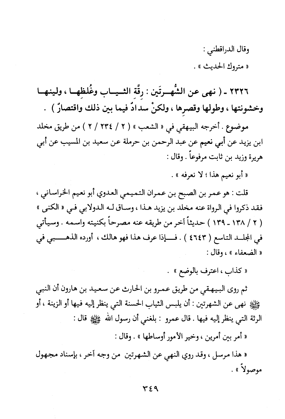 2326 - " نهى عن الشهرتين: رقة الثياب وغلظها، ولينها وخشونتها، وطولها وقصرها