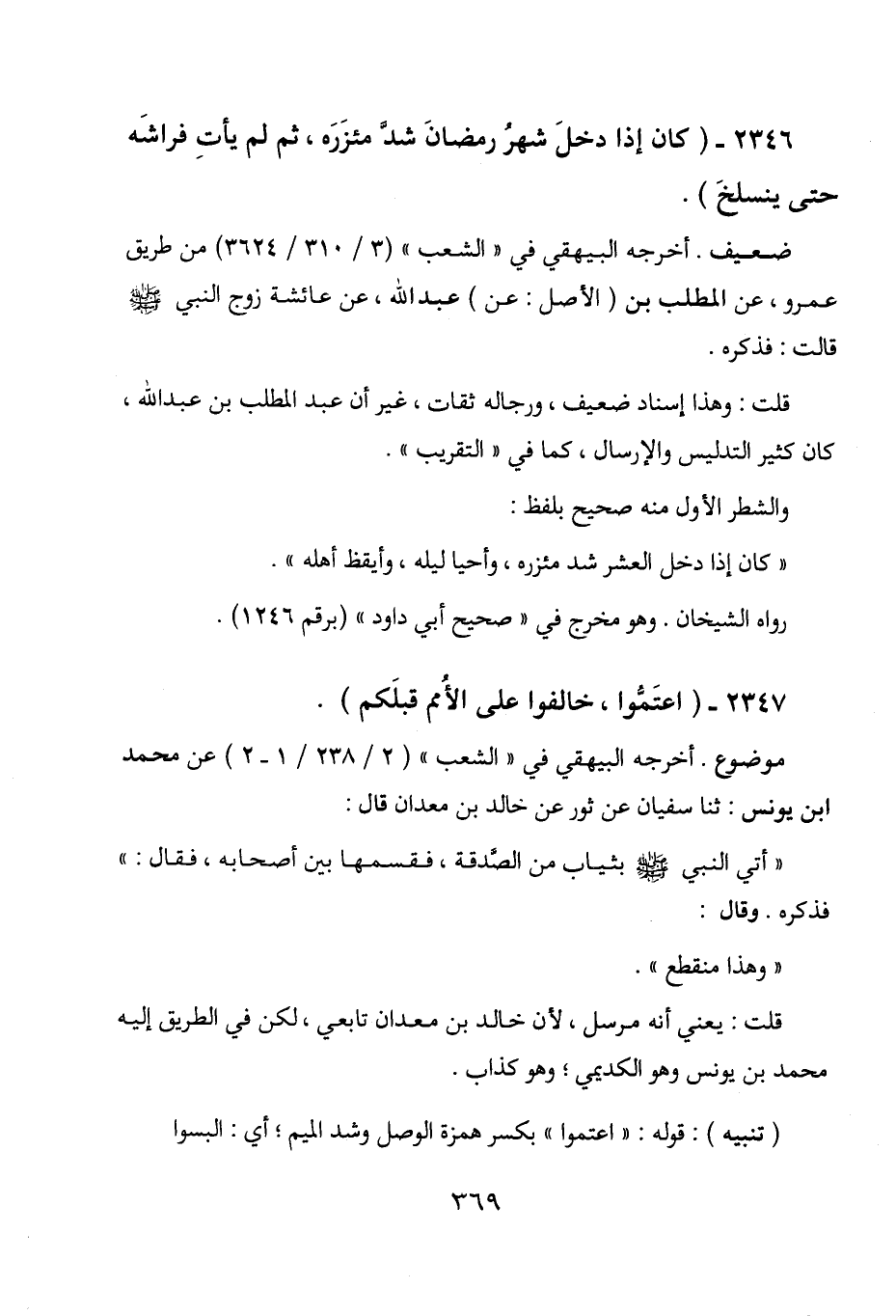 2346 - " كان إذا دخل شهر رمضان شد مئزره، ثم لم يأت فراشه حتى ينسلخ ".