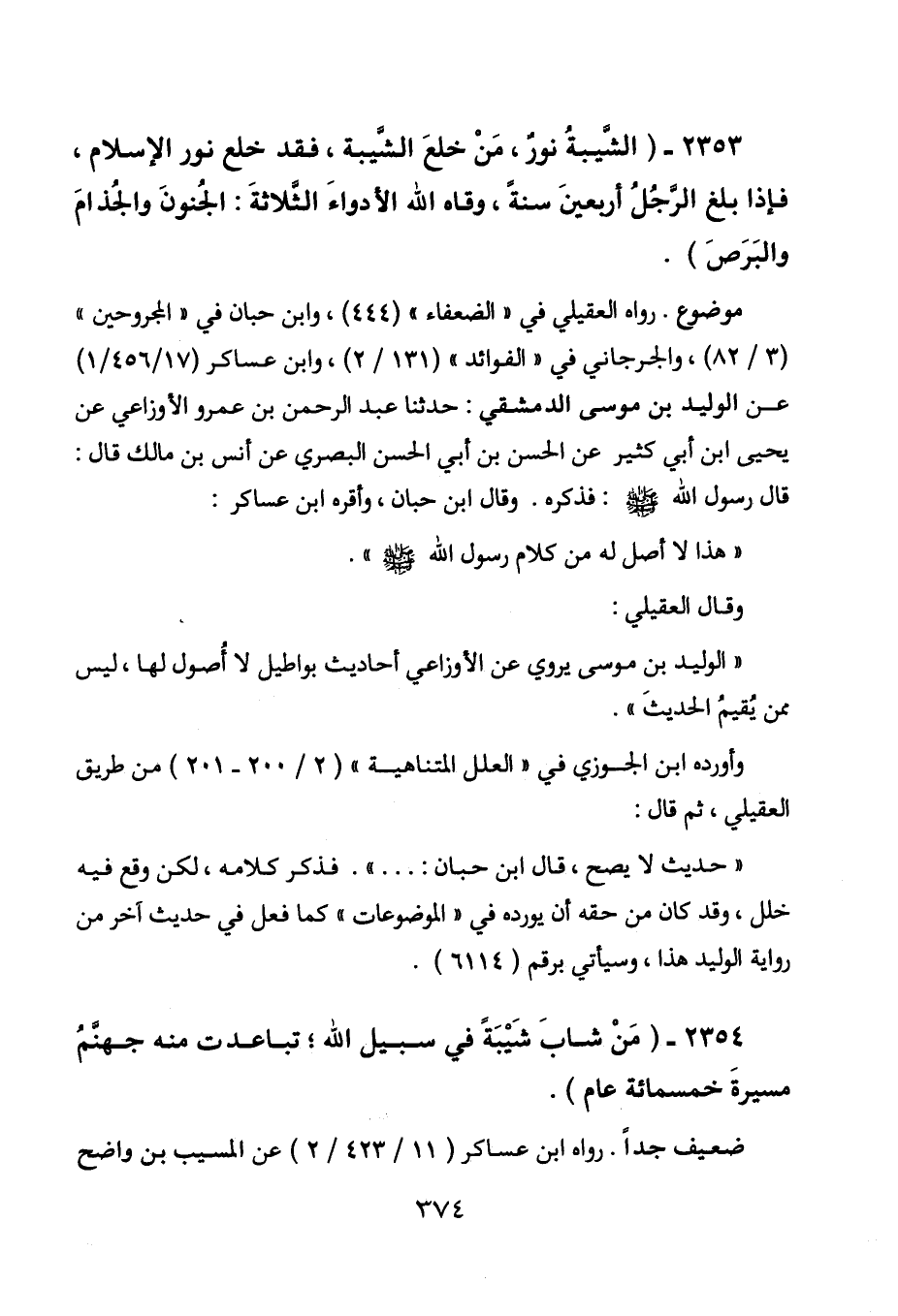 2353 - " الشيبة نور، من خلع الشيبة، فقد خلع نور الإسلام، فإذا بلغ الرجل أربعين