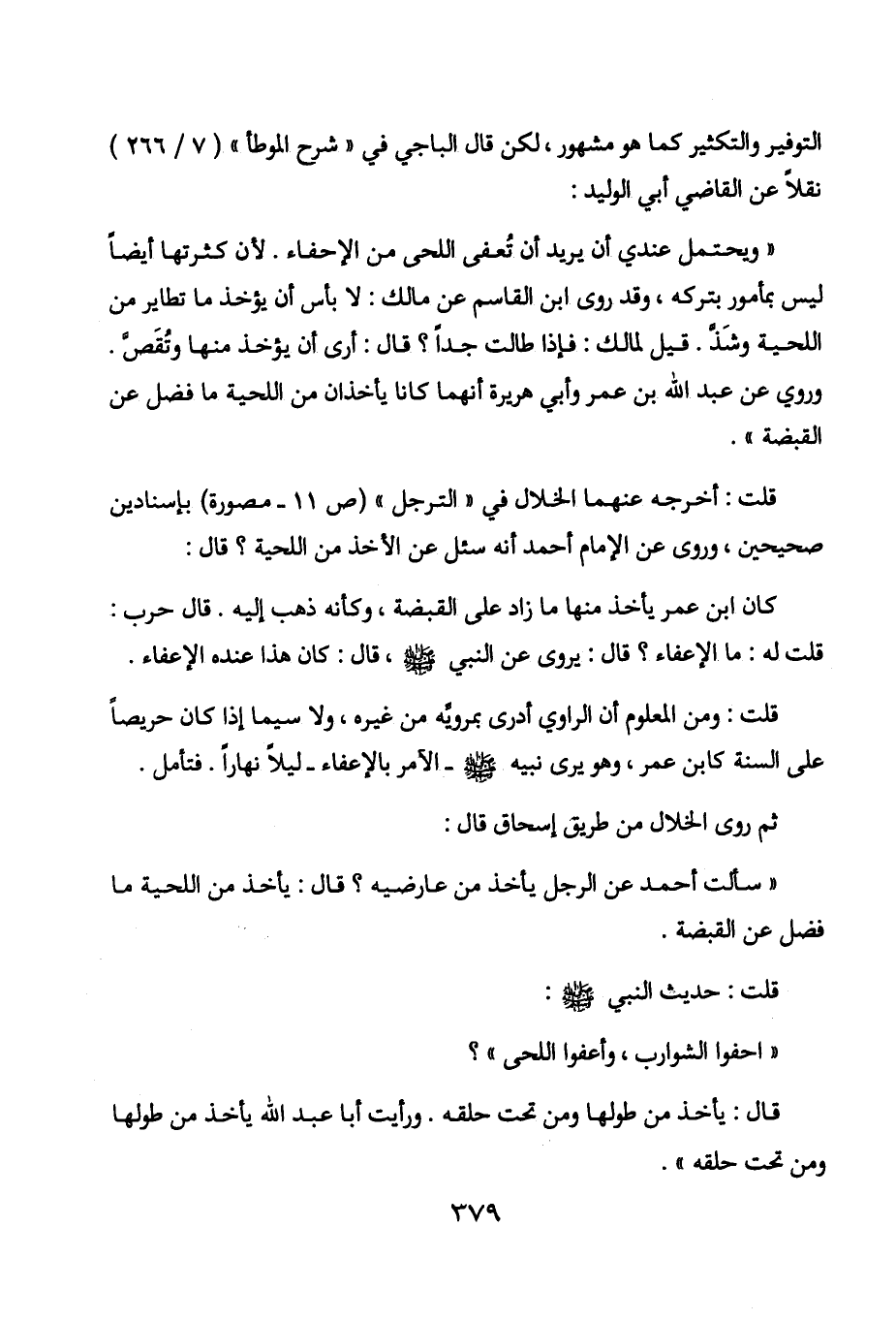 " ويحتمل عندي أن يريد أن تعفى اللحى من الإخفاء. لأن كثرتها أيضا ليس بمأمور