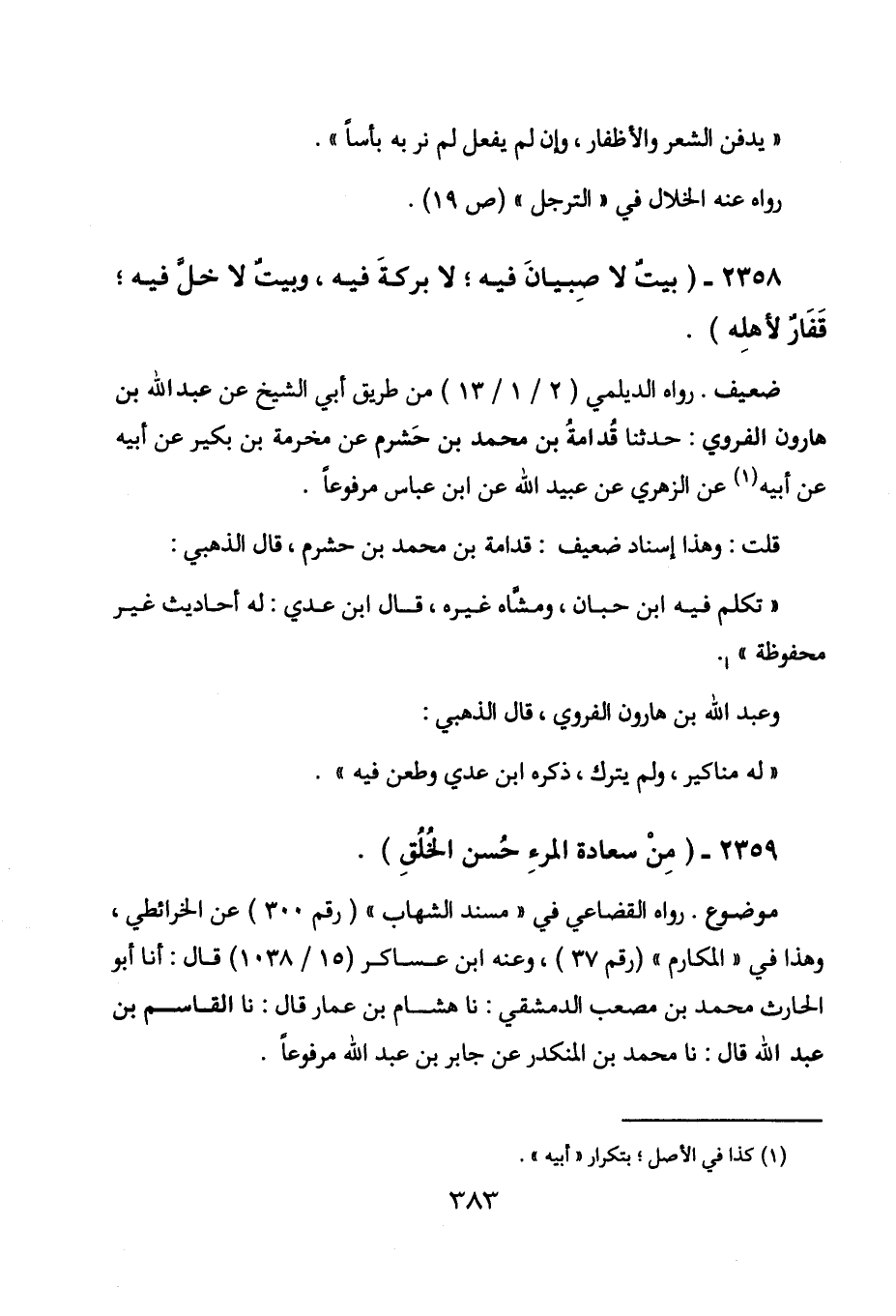 2358 - " بيت لا صبيان فيه؛ لا بركة فيه، وبيت لا خل فيه؛ قفار لأهله ".