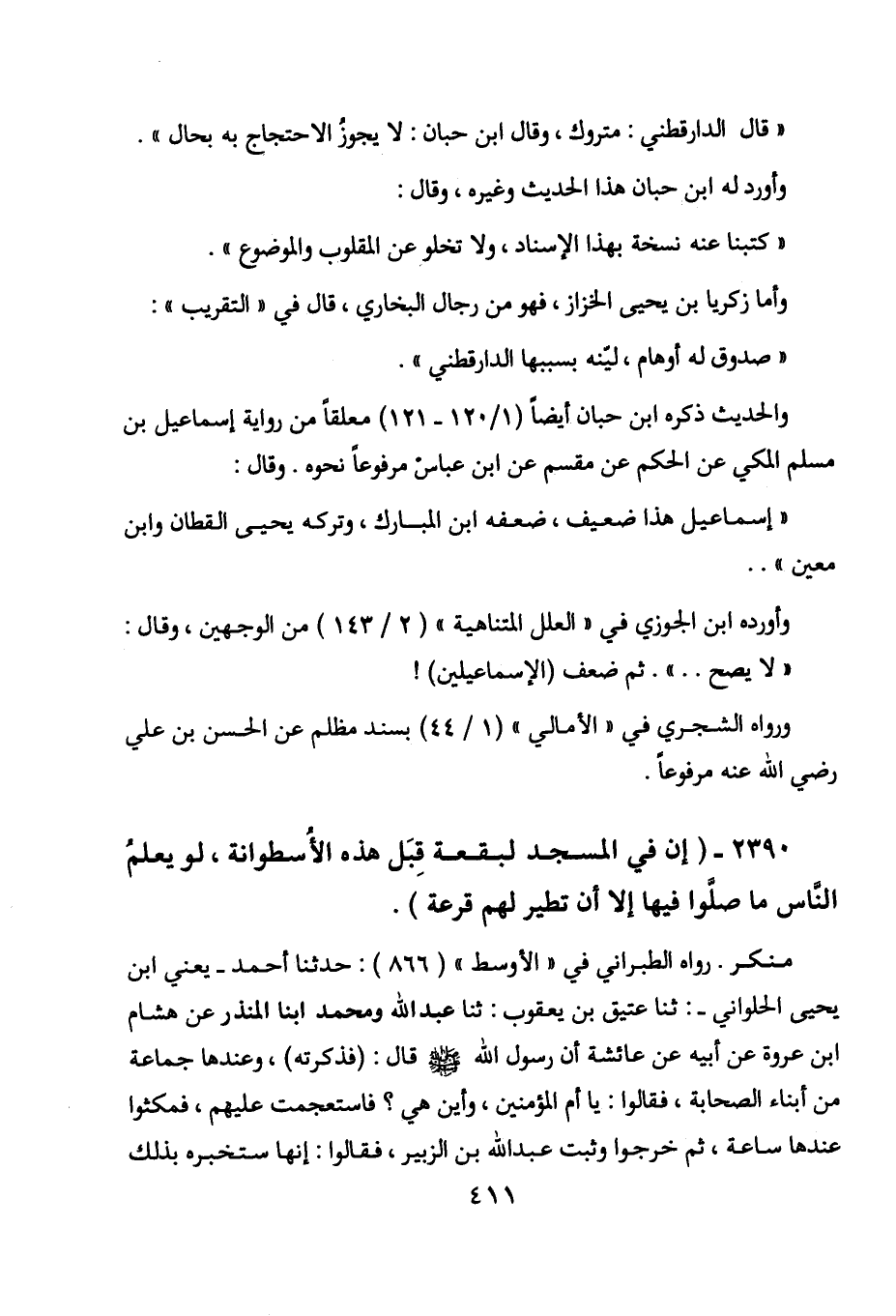 2390 - " إن في المسجد لبقعة قبل هذه الأسطوانة، لويعلم الناس ما صلوا فيها إلا أن
