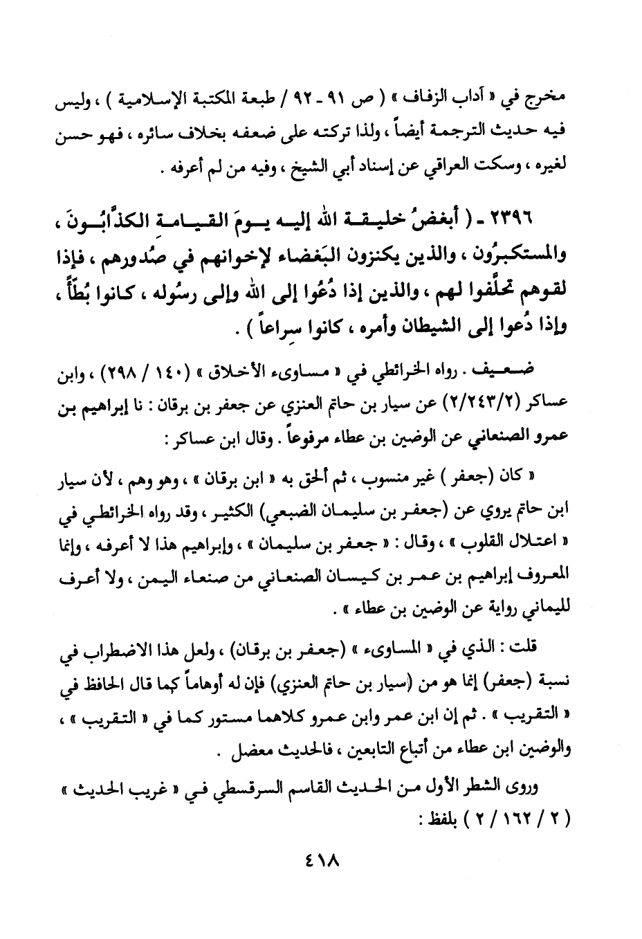 2396 - " أبغض خليقة الله إليه يوم القيامة الكذابون، والمستكبرون، والذين يكنزون