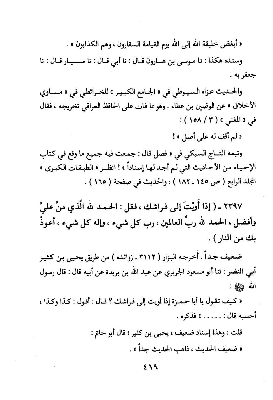" كيف تقول يا أبا حمزة إذا أويت إلى فراشك؟ قال: أقول: كذا وكذا، أحسبه