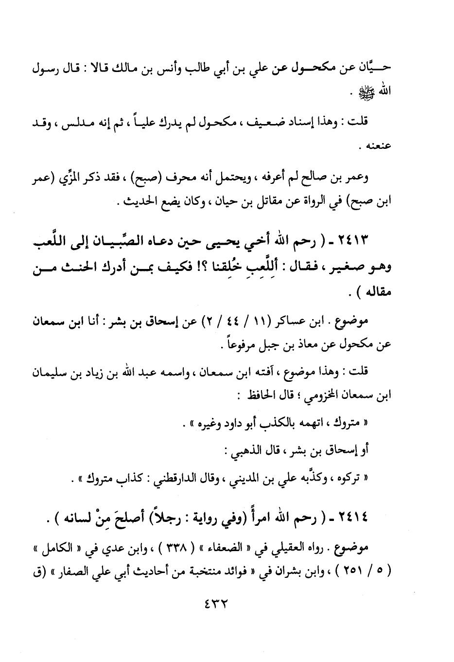 2413 - " رحم الله أخي يحيى حين دعاه الصبيان إلى اللعب وهو صغير، فقال: أللعب