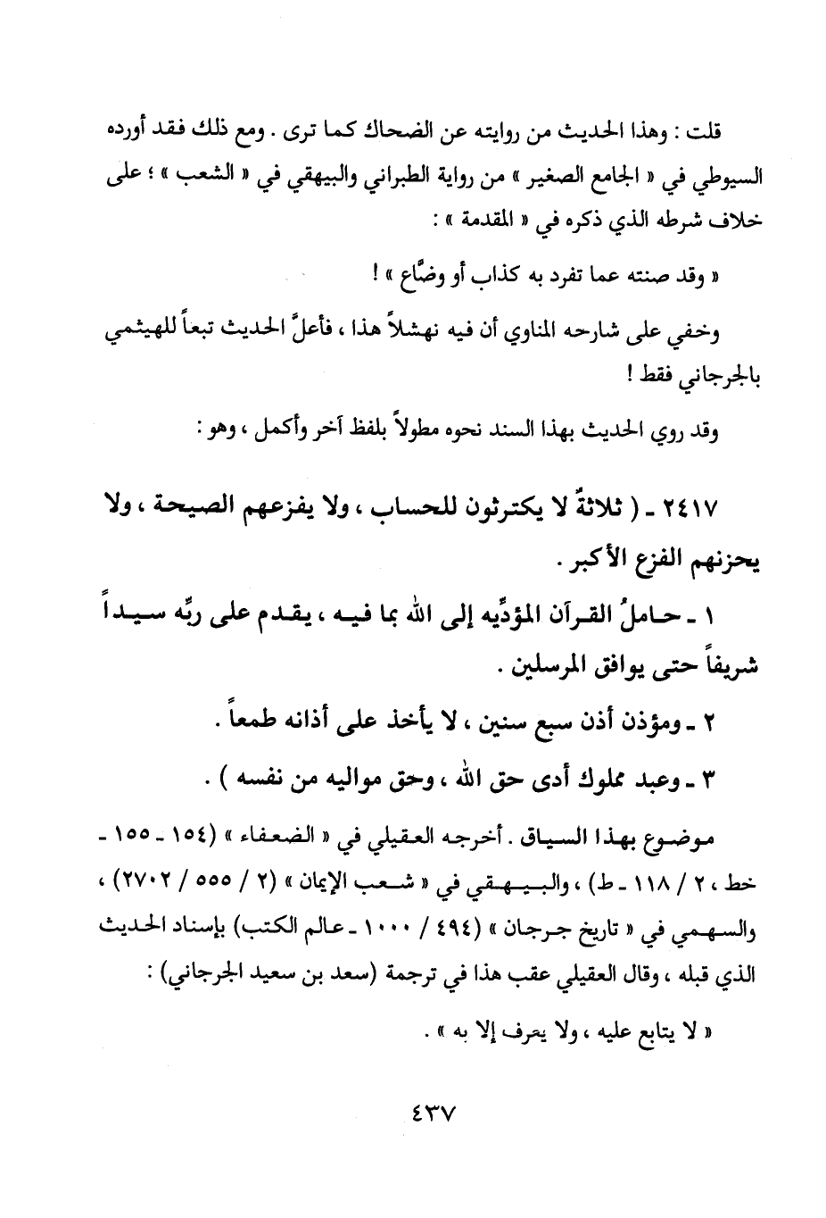 2417 - " ثلاثة لا يكترثون للحساب، ولا يفزعهم الصيحة، ولا يحزنهم الفزع الأكبر.
