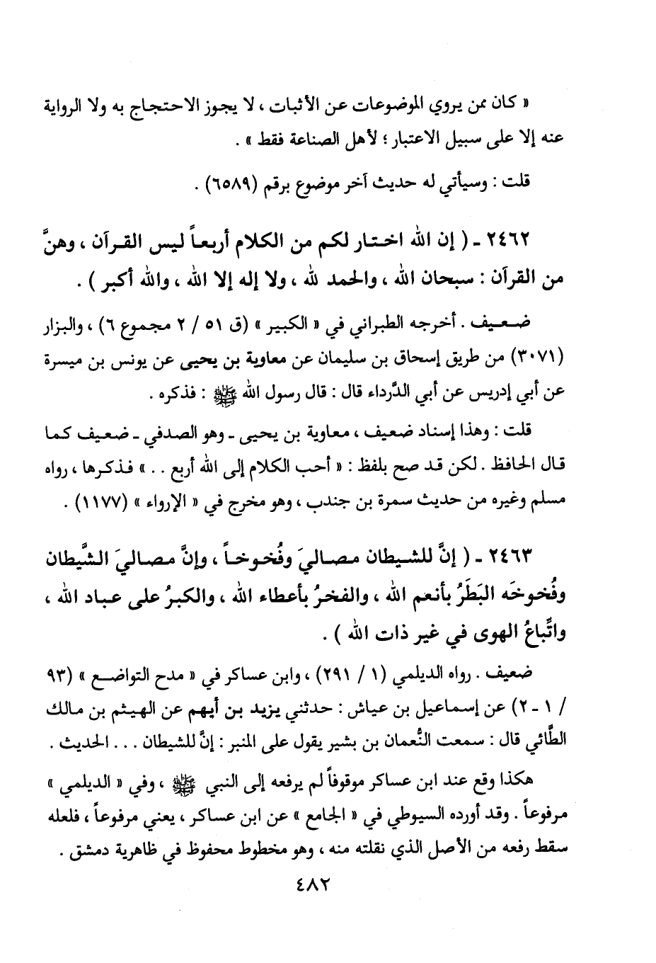 2462 - " إن الله اختار لكم من الكلام أربعا ليس القرآن، وهن من القرآن: سبحان الله