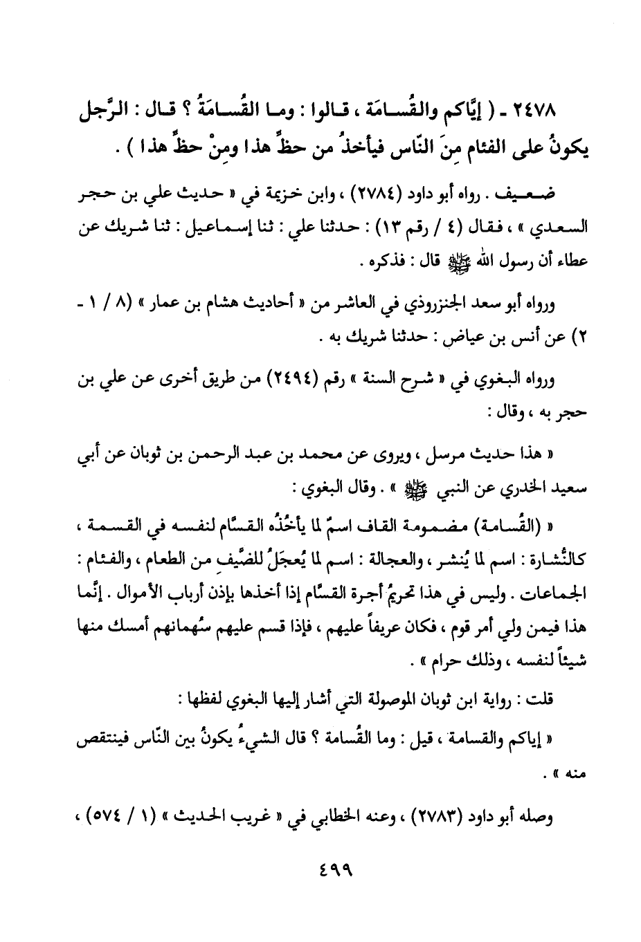2478 - " إياكم والقسامة، قالوا: وما القسامة؟ قال: الرجل يكون على الفئام من