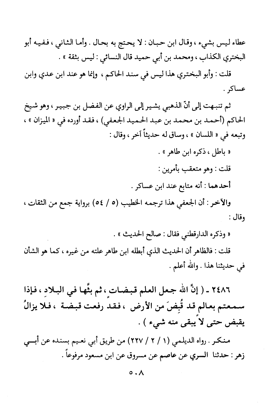 2486 - " إن الله جعل العلم قبضات، ثم بثها في البلاد، فإذا سمعتم بعالم قد قبض من