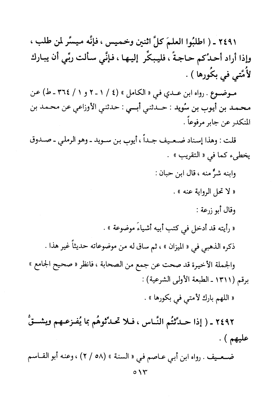 2491 - " اطلبوا العلم كل اثنين وخميس، فإنه ميسر لمن طلب، وإذا أراد أحدكم حاجة،