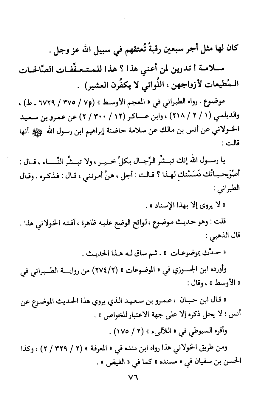 كان لها مثل أجر سبعين رقبة تعتقهم في سبيل الله عز وجل.سلامة! تدرين لمن أعني هذا؟ هذا للمتعففات الصالحات المطيعات لأزواجهن، اللواتي لا يكفرن العشير ".