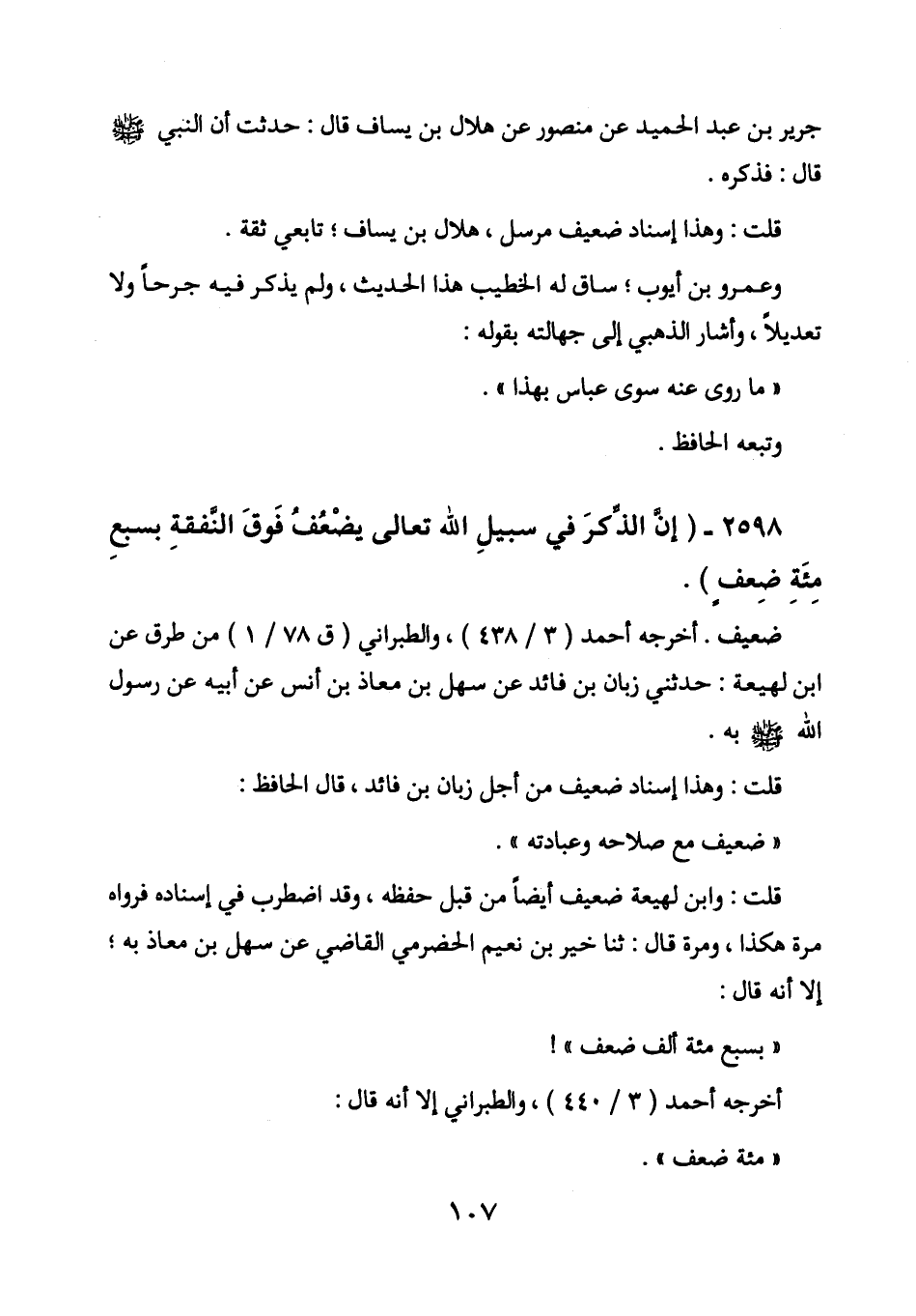 2598 - (إن الذكر في سبيل الله تعالى يضعف فوق النفقة بسبع مئة ضعف) .