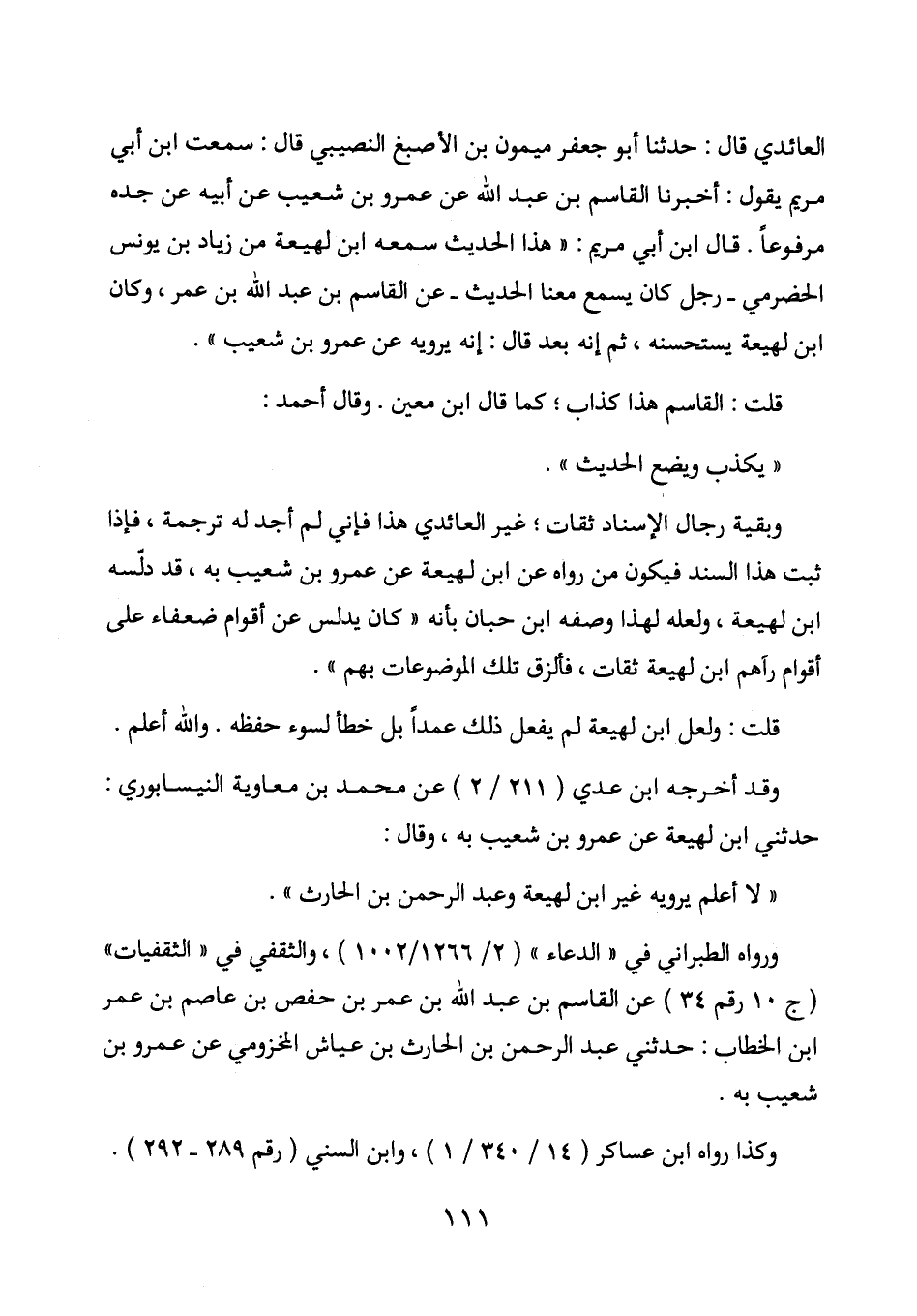 وبقية رجال الإسناد ثقات؛ غير العائدي هذا فإني لم أجد له ترجمة، فإذا ثبت هذا السند فيكون من وراه عن ابن لهيعة عن عمرو بن شعيب به، قد دلسه ابن لهيعة، ولعله لهذا وصفه ابن حبان بأنه " كان يدلس عن أقوام ضعفاء على أقوام رآهم ابن لهيعة ثقات، فألزق تلك الموضوعات بهم ".