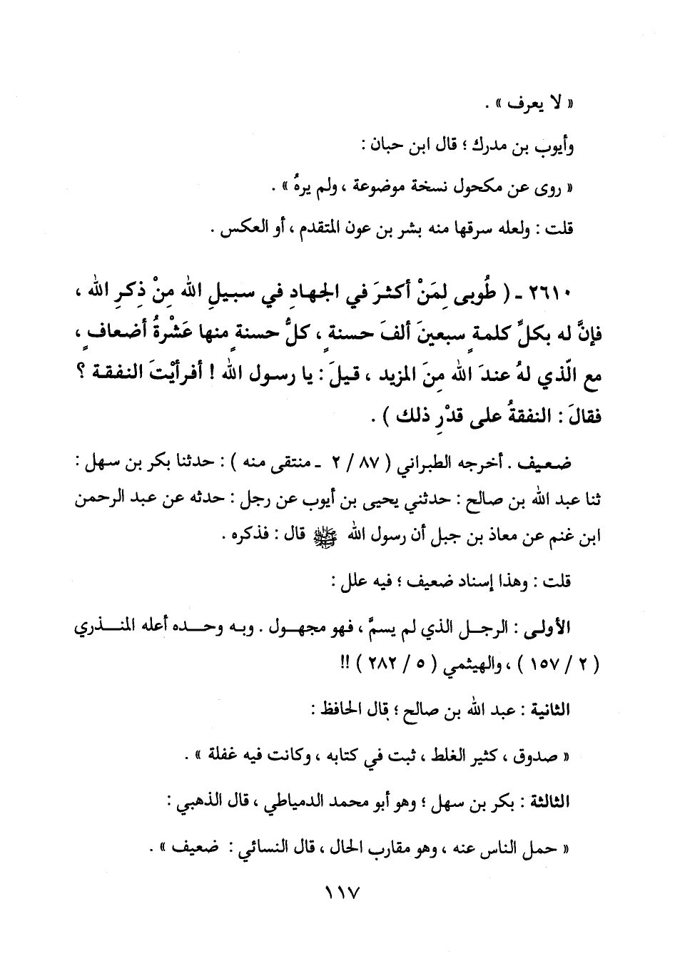 2610 - (طوبى لمن أكثر في الجهاد في سبيل الله من ذكر الله، فإن له بكل كلمة سبعين ألف حسنة، كل حسنة منها عشرة أضعاف، مع الذي له عند الله من المزيد، قيل: يا رسول الله! أفرأيت النفقة؟ فقال: النفقة على قدر ذلك) .