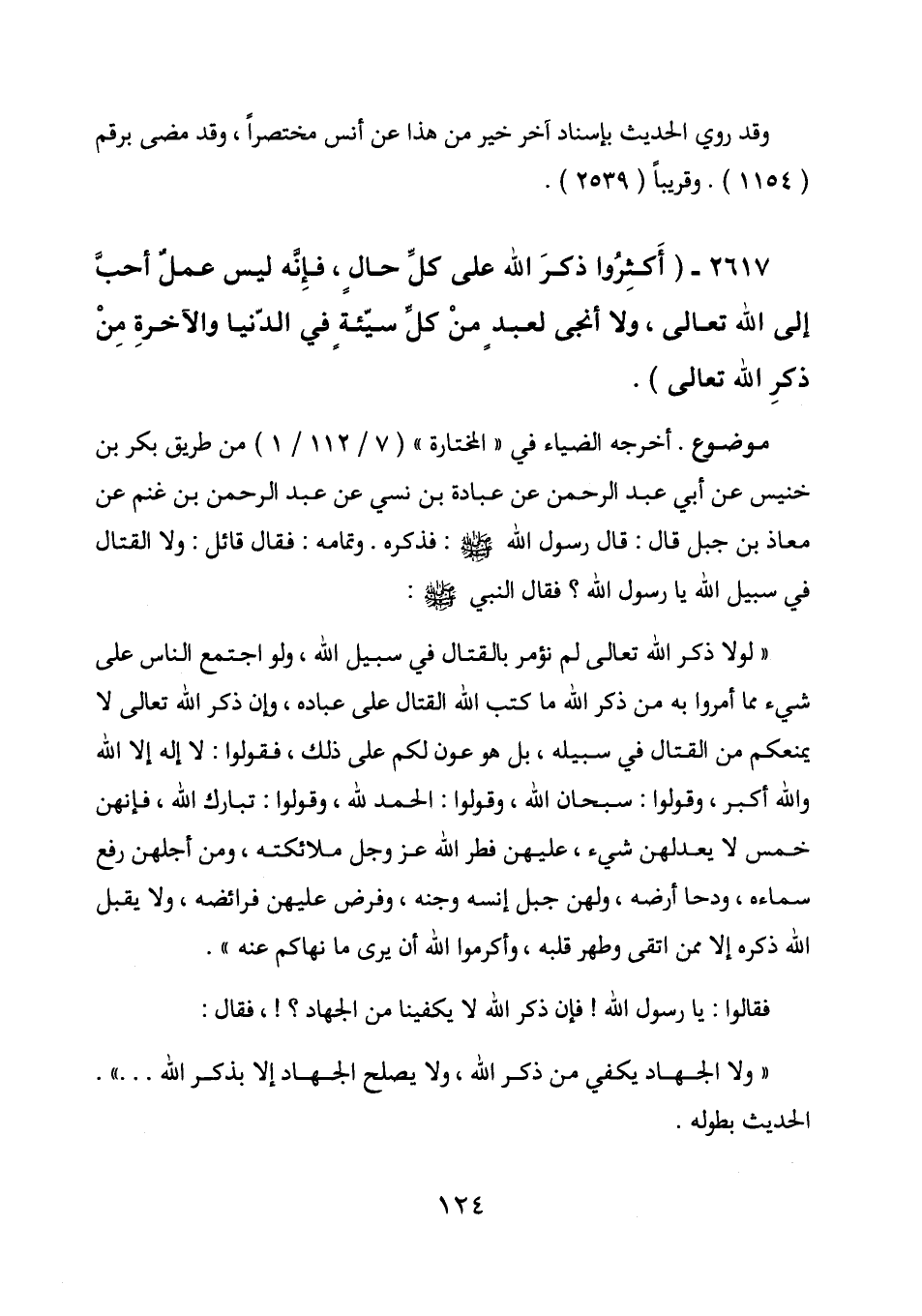 " ولا الجهاد يكفي من ذكر الله، ولا يصلح الجهاد إلا بذكر الله. . . ". الحديث بطوله.