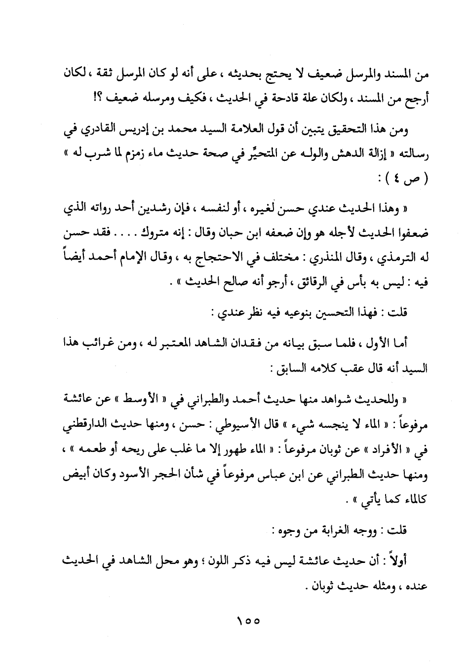 ومن هذا التحقيق يتبين أن قول العلامة السيد محمد بن إدريس القادري في رسالته " إزالة الدهش والوله عن المتحير في صحة حديث ماء زمزم لما شرب له " (ص 4) :