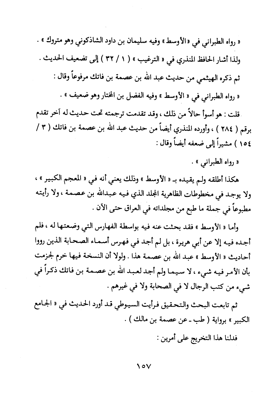 وأما " الوسط " فقد بحثت عنه فيه بواسطة الفهارس التي وضعتها له، فلم أجده فيه إلا عن أبي هريرة، بل لم أجد في فهرس أسماء الصحابة الذين رووا أحاديث " الأوسط " عبد الله بن عصمة هذا. ولولا أن النسخة فيها خرم لجزمت بأن الأمر فيه شيء من كتب الرجال لا في الصحابة ولا في غيرهم.