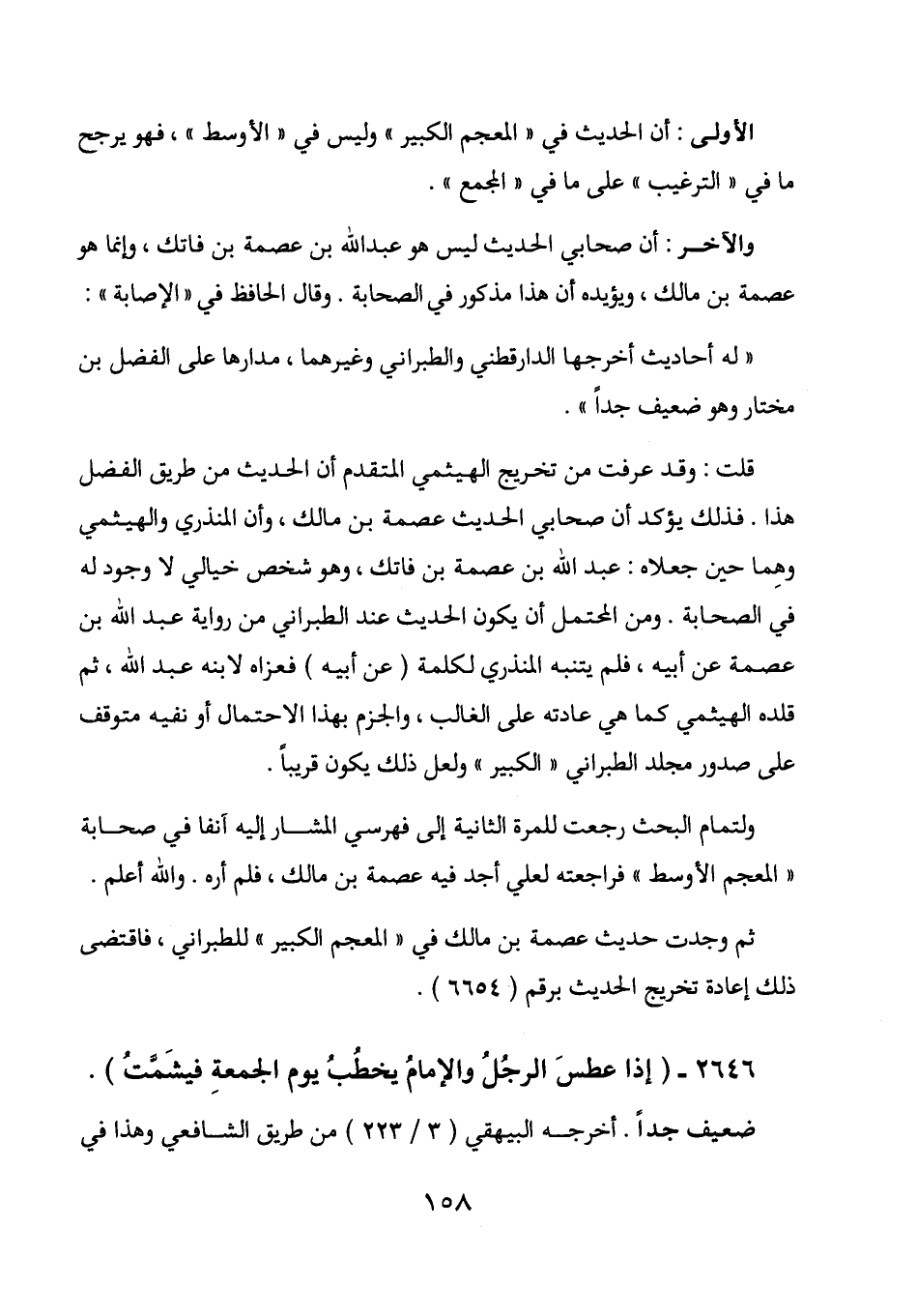 قلت: وقد عرفت من تخريج الهيثمي المتقدم أن الحديث من طريق الفضل هذا. فذلك يؤكد أن صحابي الحديث عصمة بن مالك، وأن المنذري والهيثمي وهما حين جعلاه: عبد الله بن عصمة بن فاتك، وهو شخص خيالي لا وجود له في الصحابة. ومن المحتمل أن يكون الحديث عند الطبراني من رواية عبد الله بن عصمة عن أبيه، فلم يتنبه المنذري لكلمة (عن أبيه) فعزاه لابنه عبد الله، ثم قلده الهيثمي كما هي عادته على الغالب، والجزم بهذا الاحتمال أو نفيه متوقف على صدور مجلد الطبراني " الكبير " ولعل ذلكل يكون قريبا.
