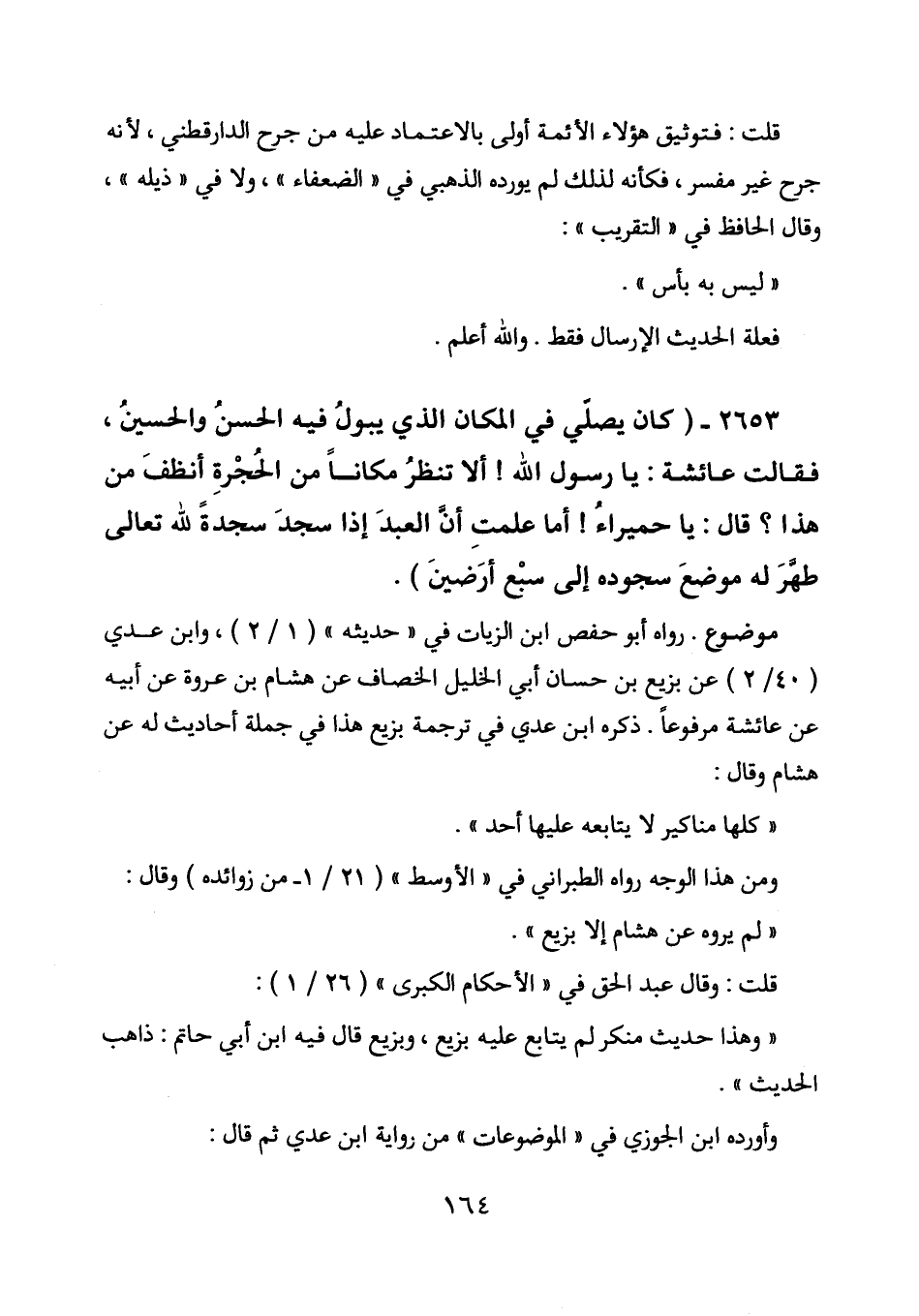2653 - (كان يصلي في المكان الذي يبول فيه الحسن والحسين، فقالت عائشة: يا رسول الله! ألا تنظر مكانا أنظف من هذا؟ قال: يا حميراء! أما علمت أن العبد إذا سجد سجدة لله تعالى طهر له موضع سجوده إلى سبع أرضين) .