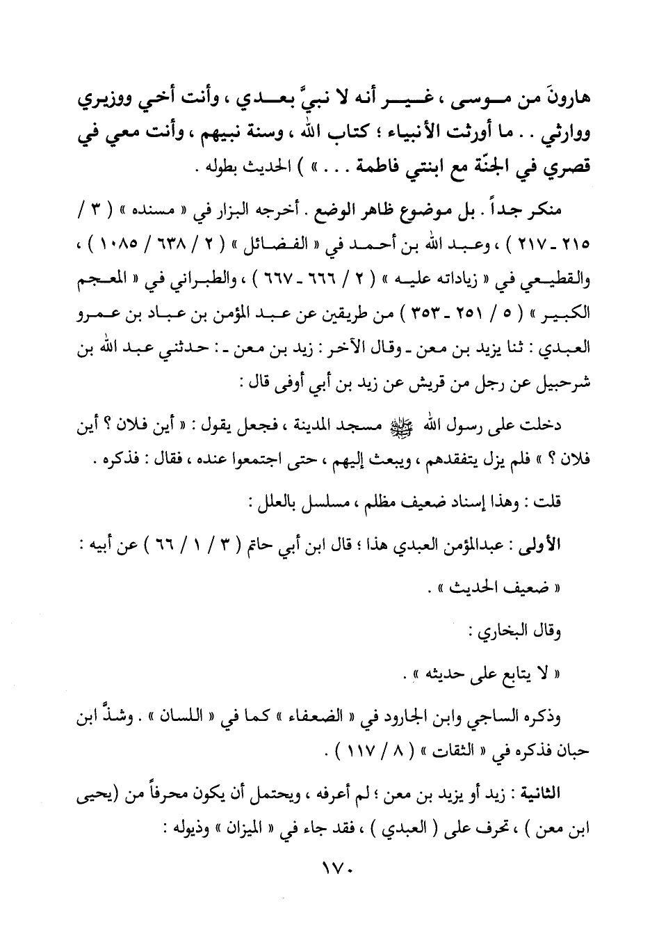بل موضوع ظاهر الوضع. أخرجه البزار في في " مسنده " (3/215/217) ، وعبد الله بن أحمد في " الفضائل " (2/638/1085) ، والقطيعي في " زياداته عليه " (2/666/667) ، والطبراني في " المعجم الكبير " (5/251/353) من طريقين عن عبد المؤمن بن عباد بن عمرو العبدي: حدثنا يزيد بن معن - وقال الآخر: زيد بن معن - حدثني عبد الله بن شر حبيل عن رجل من قريش عن زيد بن أبي أوفى قال: