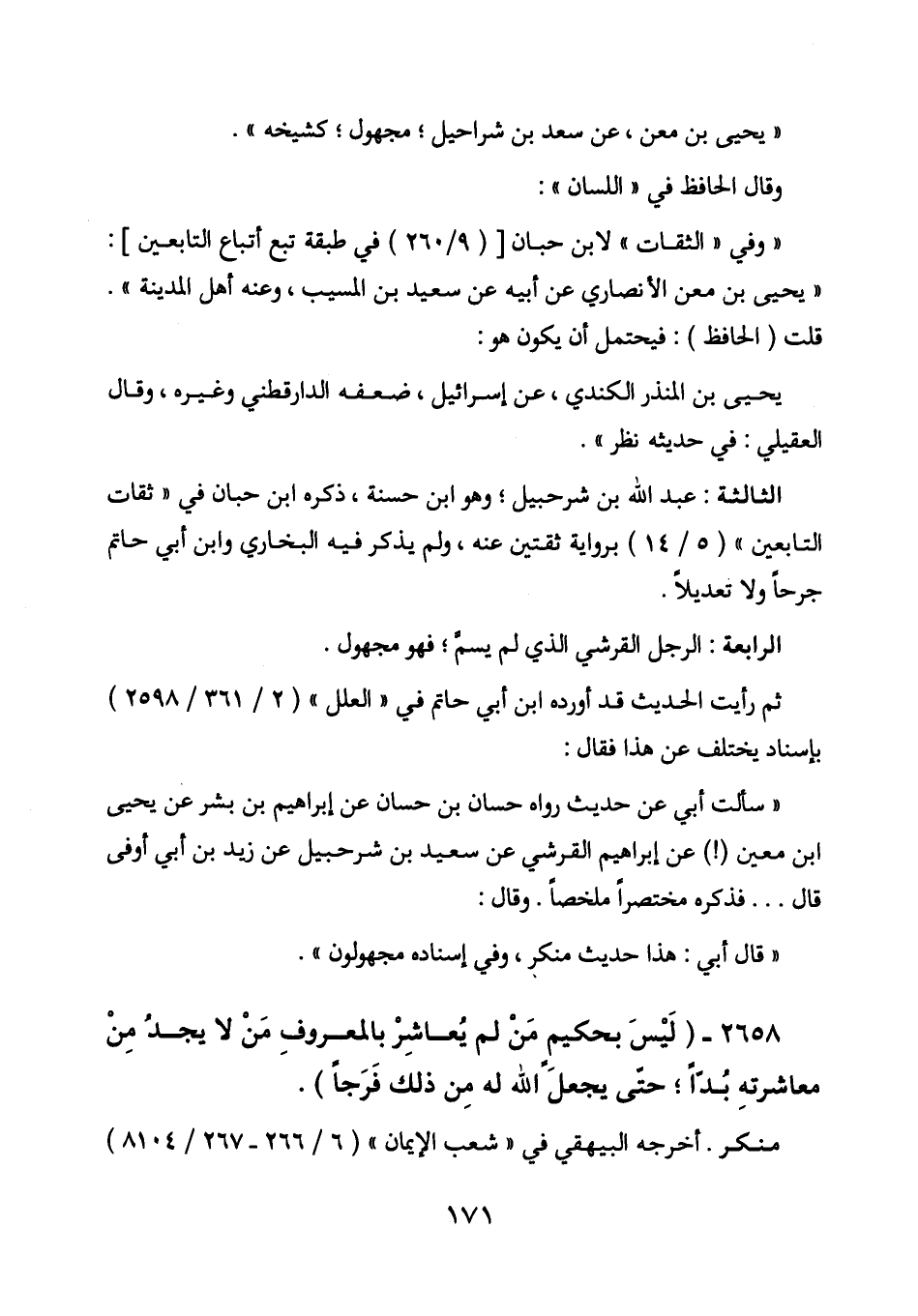 " سألت أبي عن حديث رواه حسان بن حسان عن إبراهيم بن بشر عن يحيى ابن معين (!) عن إبراهيم القرشي عن سعيد بن شرحبيل عن زيد بن أبي أوفى قال. . . فذكره مختصرا ملخصا. وقال: