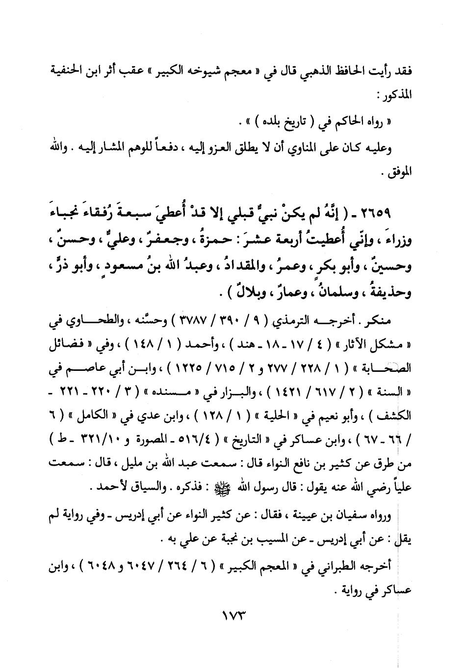2659 - (إنه لم يكن نبي قبلي إلا قد أعطي سبعة رفقاء نجباء وزراء، وإني أعطيت أربعة عشر: حمزة، وجعفر، وعلي، وحسن، وحسين، وأبو بكر، وعمر، والمقداد، وعبد الله بن مسعود، وأبو ذر، وحذيفة، وسليمان، وعمار، وبلال) .