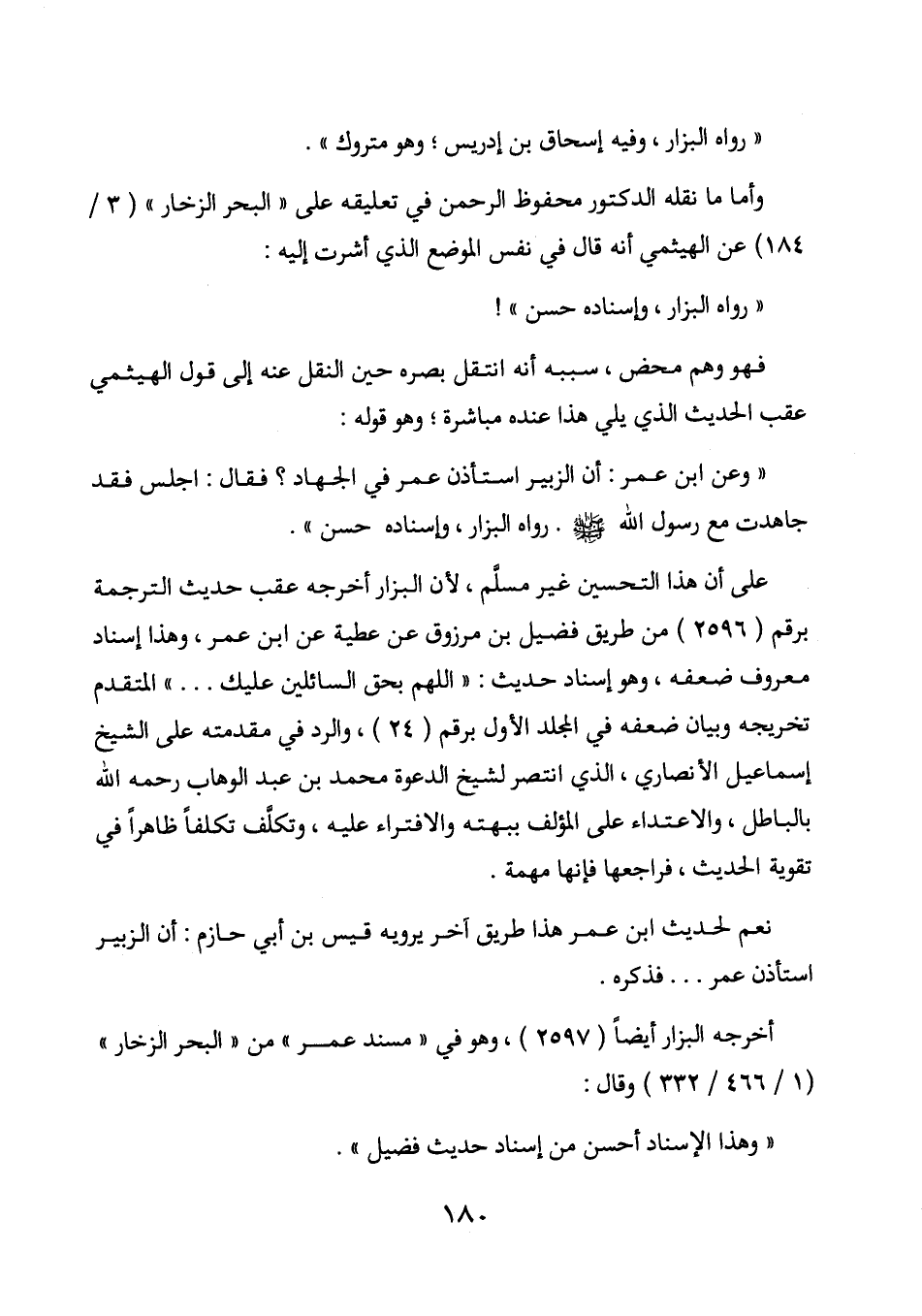" وعن ابن عمر: أن الزبير استأذن عمر في الجهاد؟ فقال: اجلس فقد جاهدت مع رسول الله صلى الله عليه وسلم. رواه البزار، وإسناده حسن ".