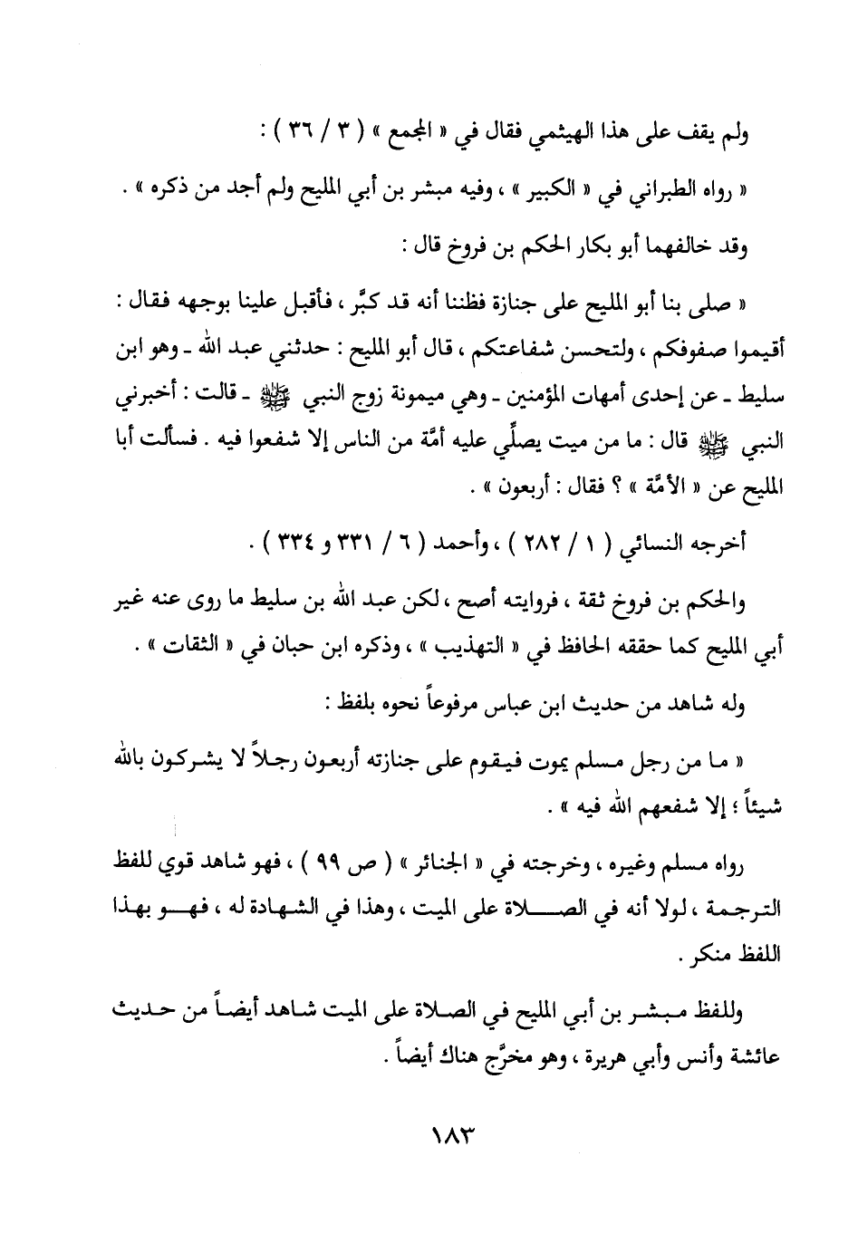 " صلى بنا أبو المليح على جنازة فظننا أنه قد كبر، فأقبل علينا بوجهه فقال: أقيموا صفوفكم، ولتحسن شفاعتكم، قال أبو المليح: حدثني عبد الله - وهو ابن سليط - عن إحدى أمهات المؤمنين - وهي ميمونة زوج النبي صلى الله عليه وسلم - قالت: أخبرني النبي صلىاللع عليه وسلم قال: ما من ميت يصلي عليه أمة من الناس إلا شفعوا فيه. فسألت أبا المليح عن " الأمة "؟ فقال " أربعون ".