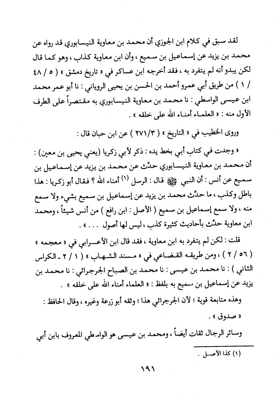 " وجدت في كتاب أبي بخط يده: ذكر لأبي زكريا (يعني يحيى بن معين) : أن محمد بن معاوية النيسابوري حدث عن محمد بن يزيد عن إسماعيل بن سميع عن أنس: أن النبي صلى الله عليه وسلم قال: الرسل أمناء الله؟ فقال أبو زكريا: هذا باطل وكذب، ما حدث محمد بن يزيد عن إسماعيل بن سميع بشيء ولا سمع منه، ولا سمع إسماعيل بن سميع (الأصل: ابن رافع) من أنس شيئا، ومحمد بن معاوية حدث بأحاديث كثيرة كذب، ليس لها أصول.... ".